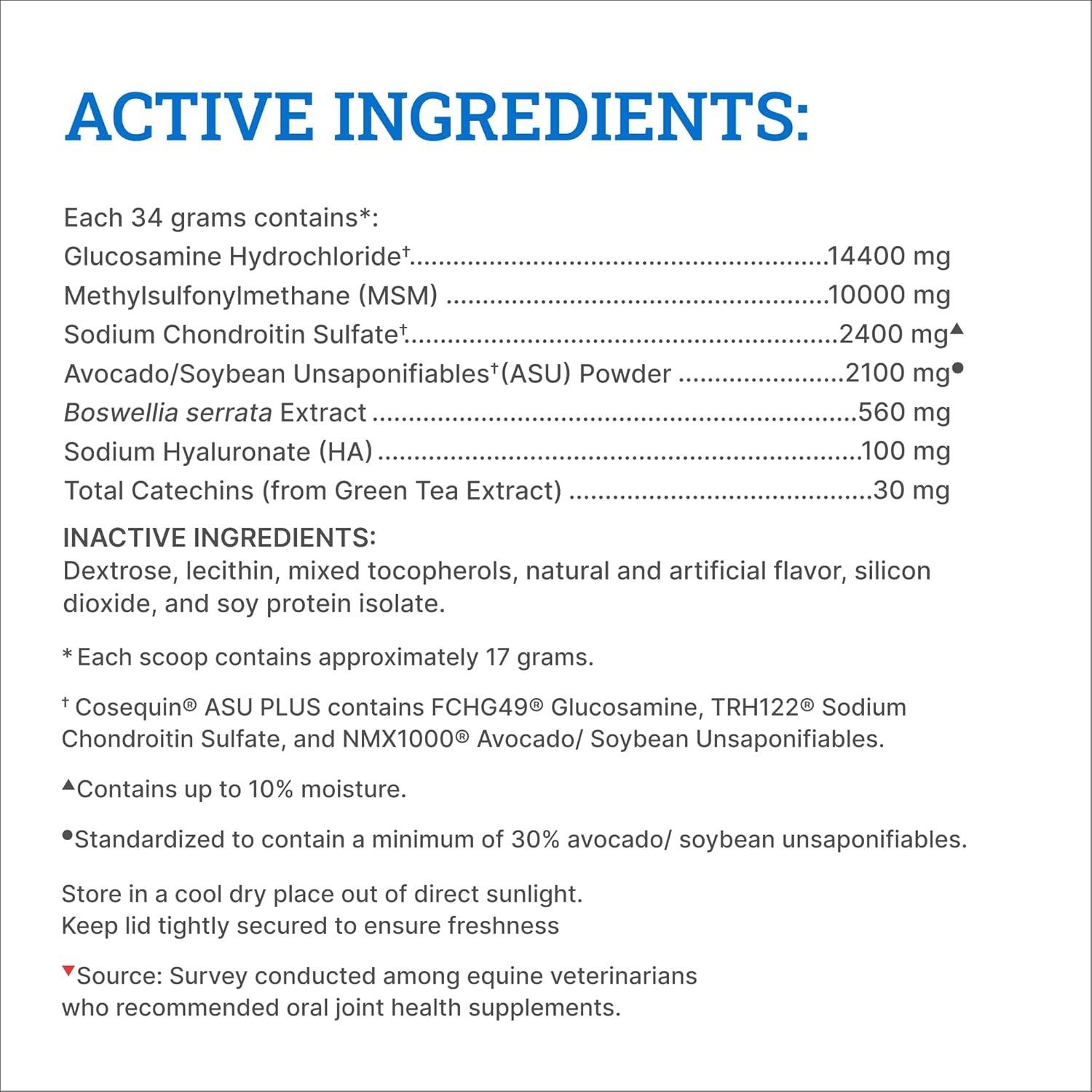 - Joint Health Support for Horses: Cosequin is the #1 veterinarian recommended joint health supplement brand*. This supplement is formulated with glucosamine, chondroitin sulfate, methylsulfonylmethane (MSM), avocado/soybean unsaponifiables (ASU), green tea extract and hyaluronic acid to support joint health