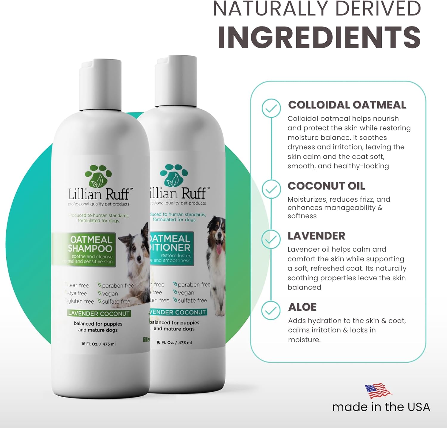 Lillian Ruff PRO Formula Deodorizing Oatmeal Dog Shampoo & Conditioner Set - Calm Itching & Allergies, Ultra-Nourishing Dry Skin Relief - Oatmeal, Aloe, Coconut Oil, Lavender & Provitamin B5, USA Made