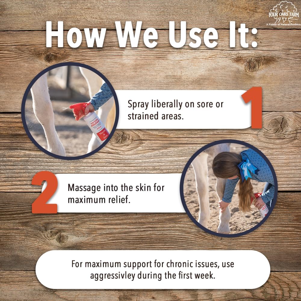 - Get Straight to the Ache: Natural Release Muscle Relaxant Spray works in minutes to help reduce equine muscle and joint stress, arthritis, tendonitis, discomfort, bruising. Can be used before or after physical exercise - we recommend both.