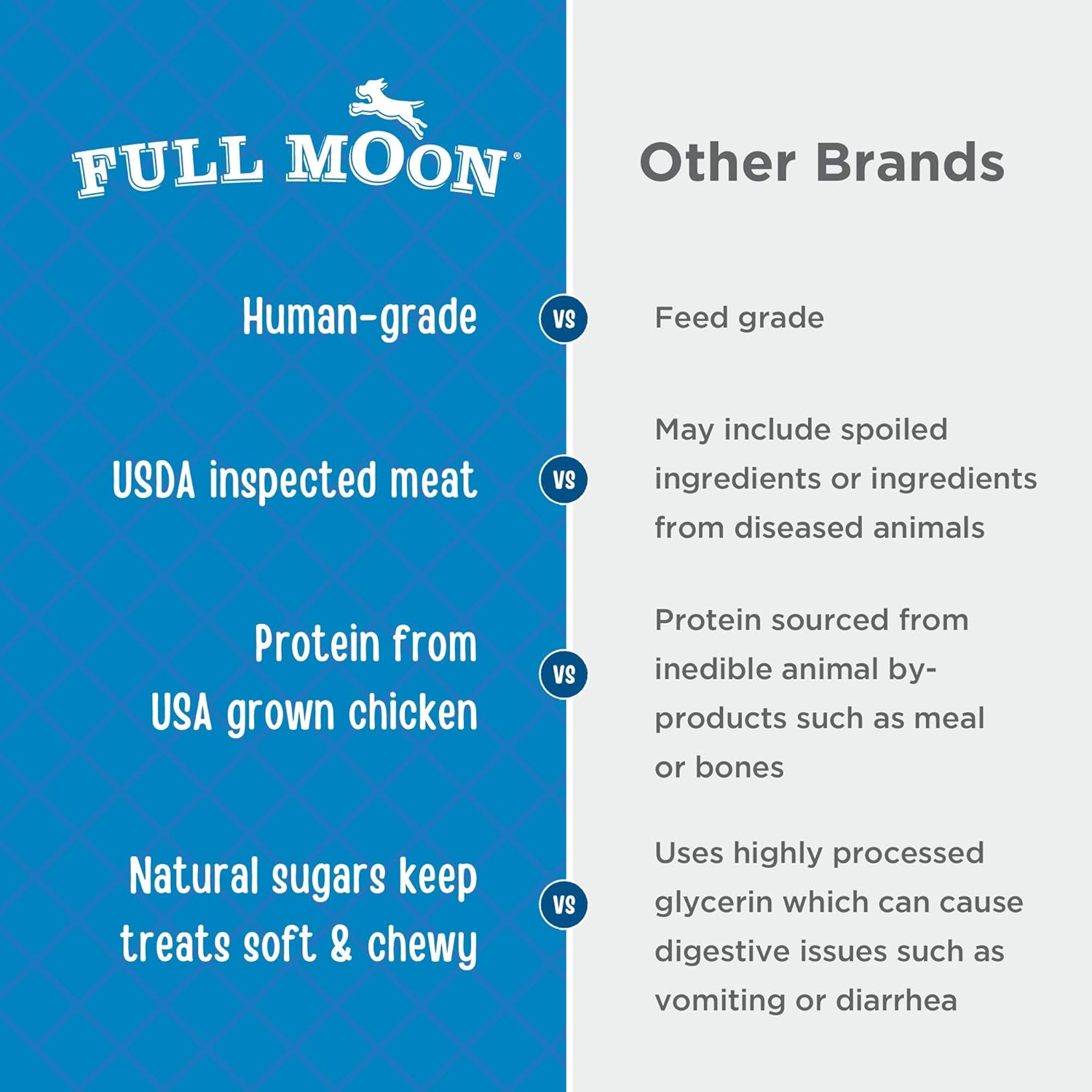 - U.S.-GROWN CHICKEN: Full Moon treats are proudly made in the United States using regionally sourced ingredients, including USDA approved, antibiotic-free chicken.