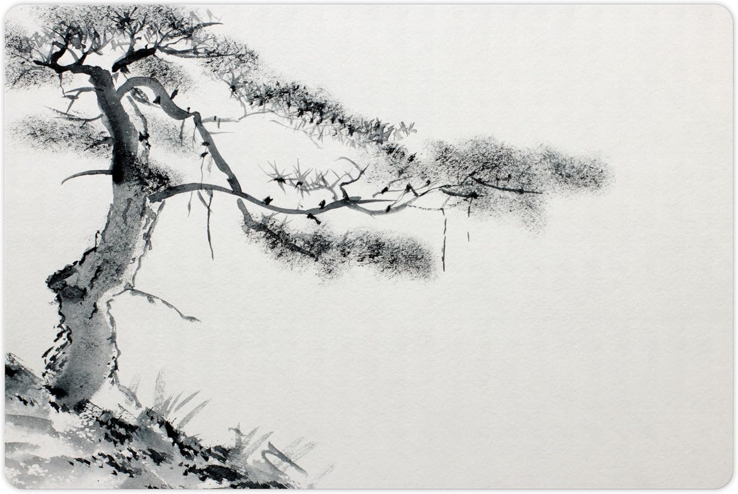 Lunarable Asian Pet Mat for Food and Water, Lone Pine on Mountain Slope Art Traditional Chinese Painting Style Oriental Culture, Rectangle Non-Slip Rubber Mat for Dogs and Cats, Grey White