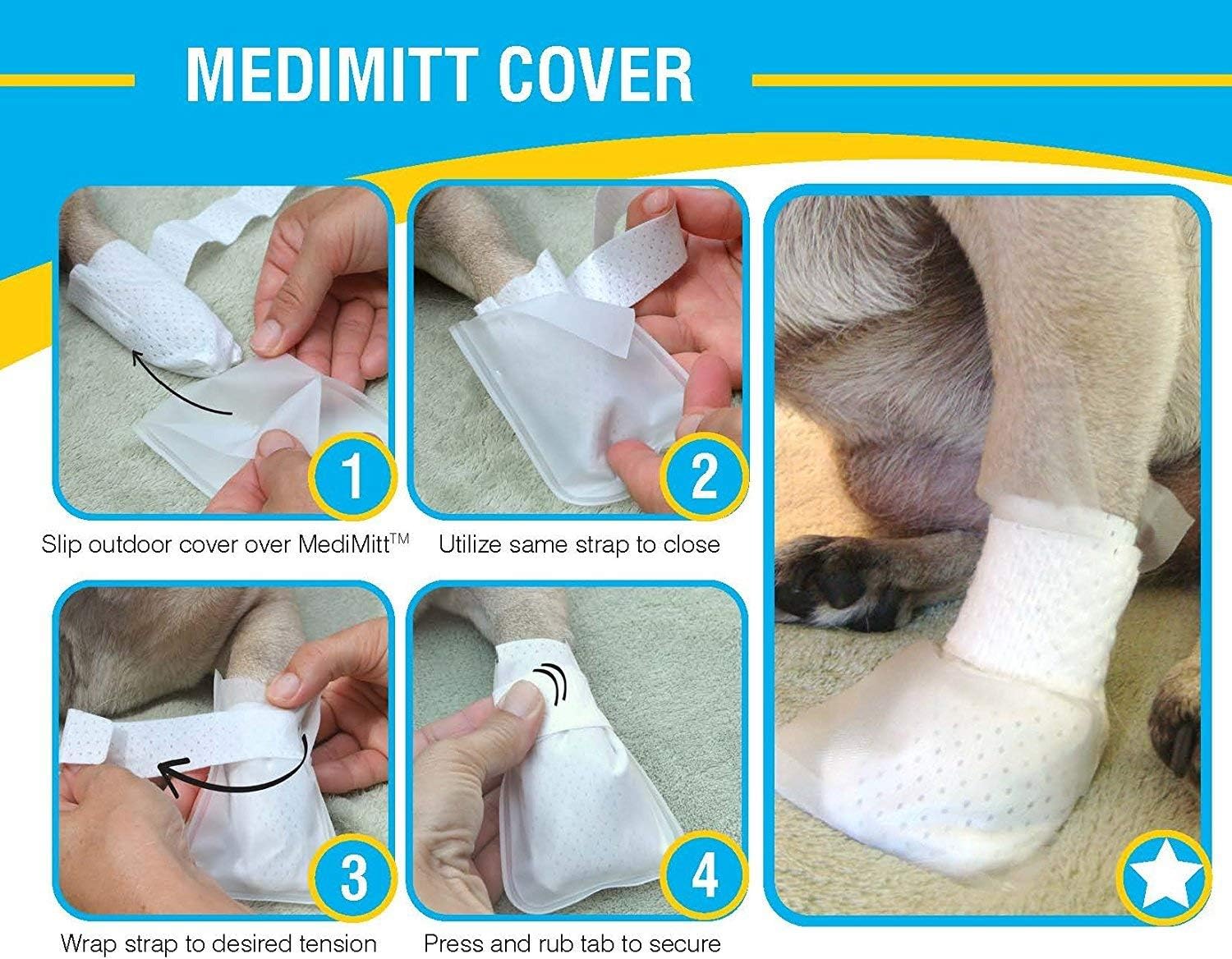 - SIMPLE AND EASY TO USE: Simply slide over Medimitt bandage; Cover features a side slit for Medimitt strap to slide into and then wrap and fasten. Waterproof Covers keeps wound dry and clean. And allow for quick outside romps while protecting bandage from getting wet or dirty.