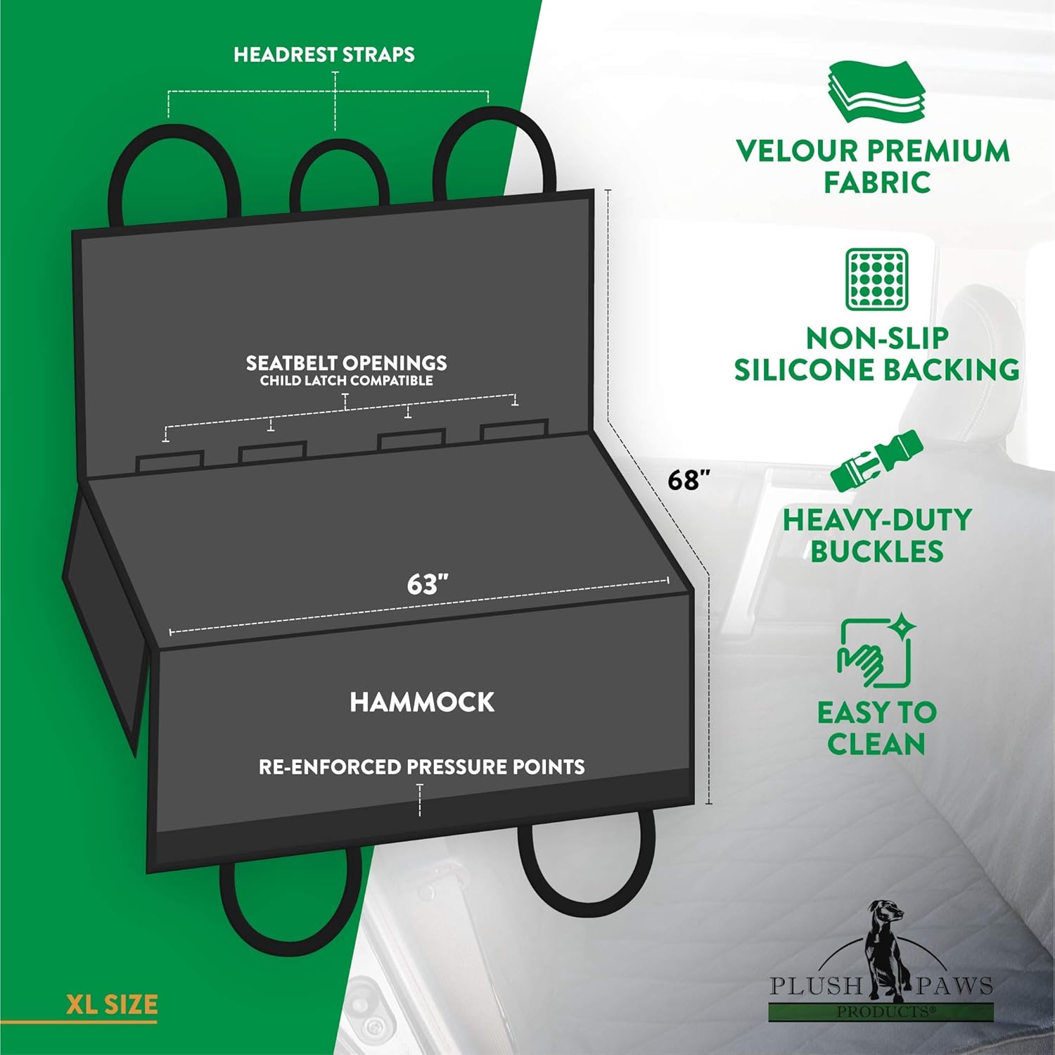 Plush Paws Products Velvet Rear Car Seat Protector w/Hammock | Washable & Waterproof Back Seat Dog Cover for Car, Truck, & SUV | Nonslip, Tear Resistant Pet Seat Cover | X-Large London Grey