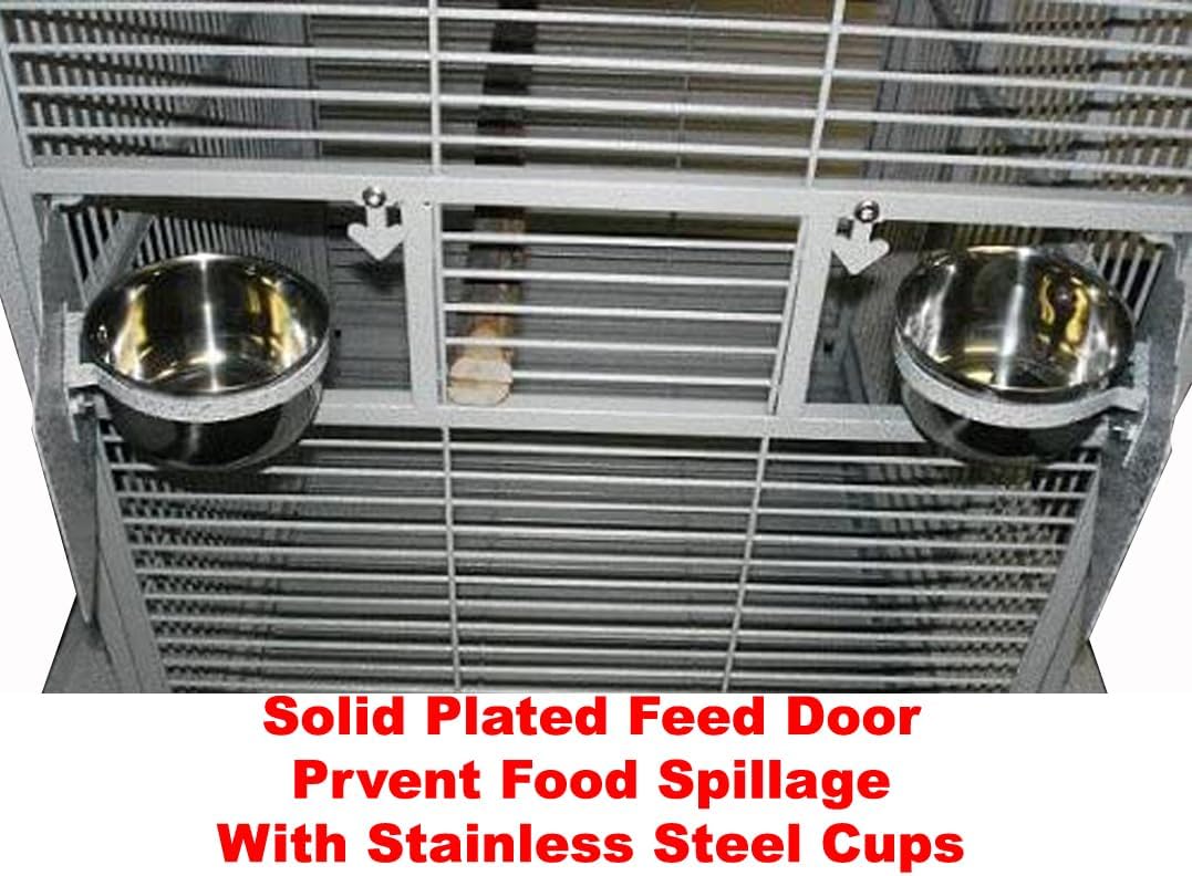 - 【Four Stainless Steel Cups】 With Swivel Solid Metal feeder doors prevent spillage, Include One Side Top Breeding Solid Door. Inside Standing Natural Wooden Perch. 【Bottom Slide-out grate and metal tray】 for easy cleaning, Four Swivel Casters for mobility and durability.