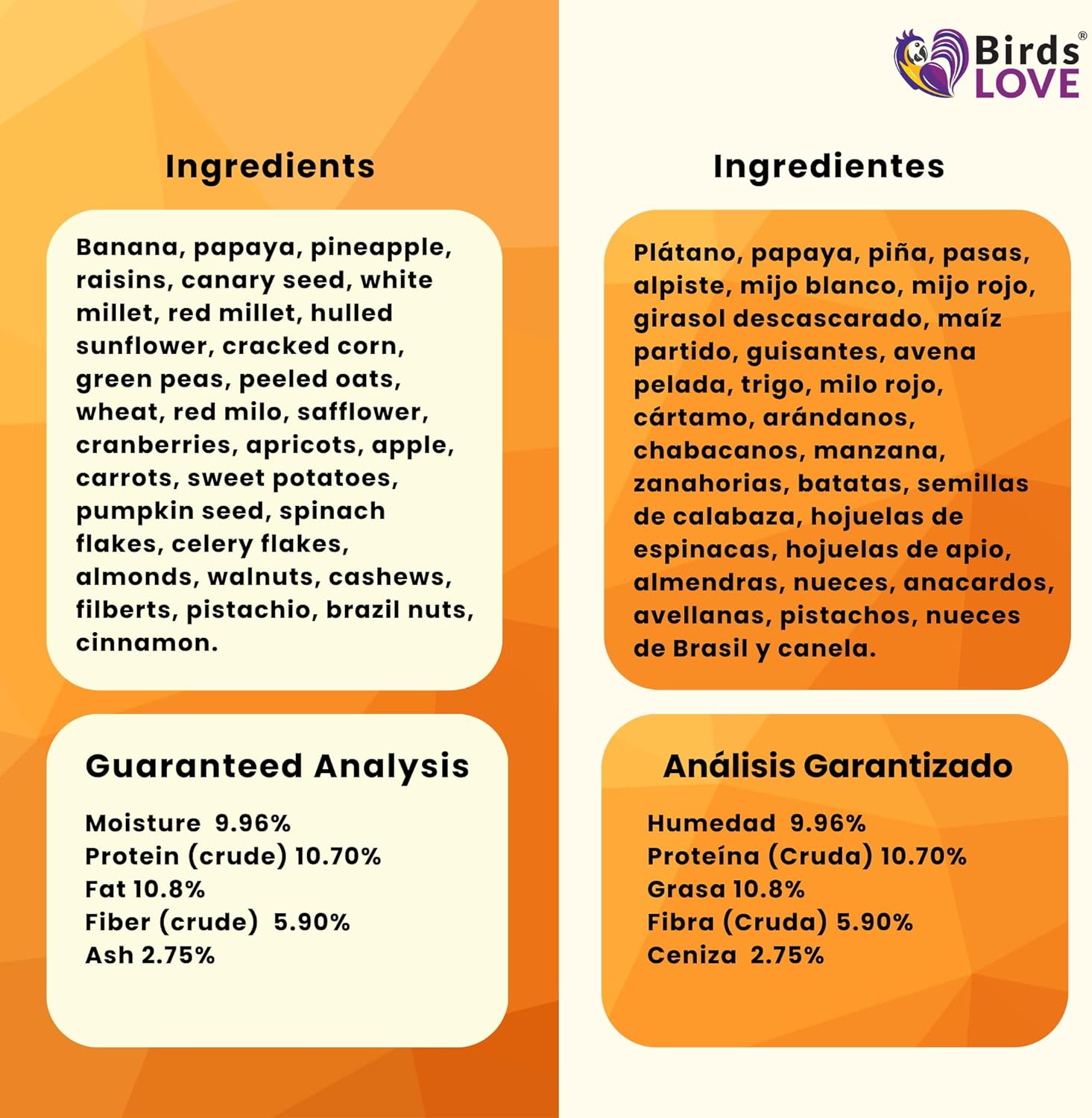- No added preservatives nor sweeteners: natural sweet fruits to maintain healthy skin, muscles, and feathers