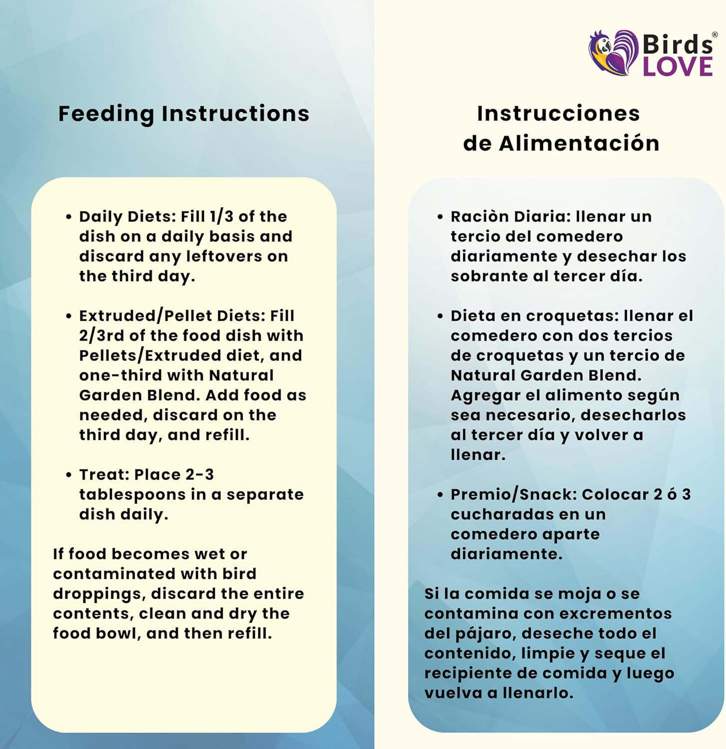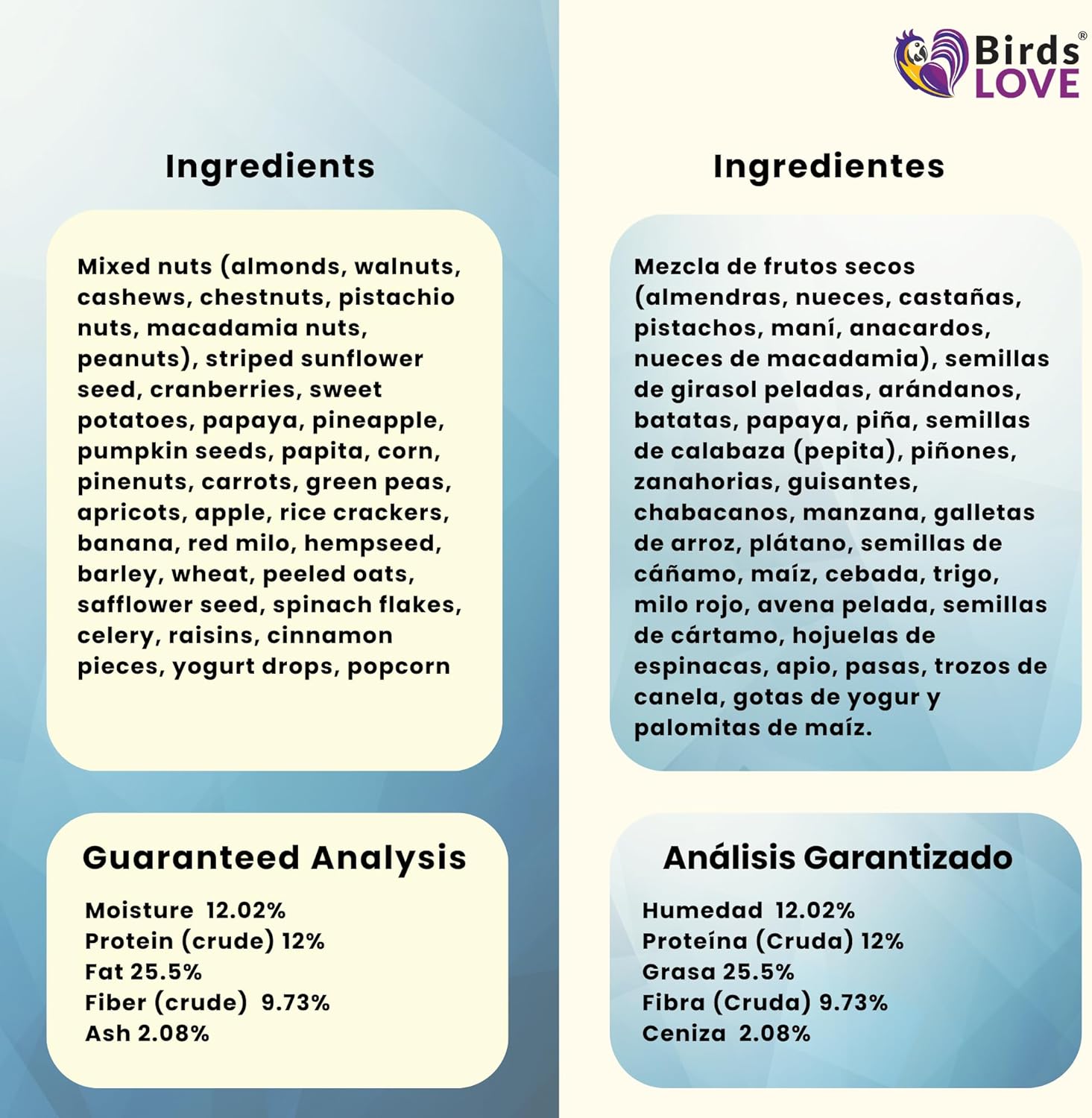 - No added preservatives nor sweeteners: natural sweet fruits to maintain healthy skin, muscles, and feathers