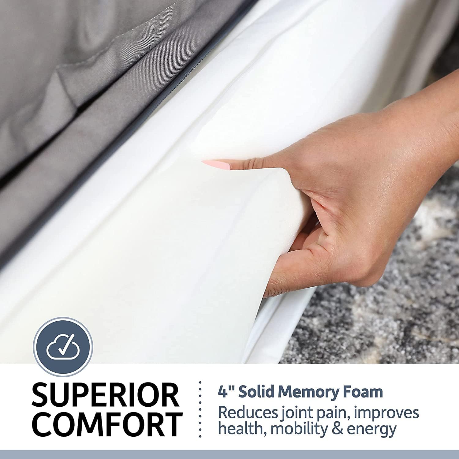 - PREMIUM COMPONENTS: (i) SOLID 4 inch MEMORY FOAM base for superior overall comfort, reduced joint pain and improved health, mobility, & energy. (ii) Recycled 'green' polyfill support bolsters are generously filled. (iii) Durable & comfortable polyester (65%) & cotton (35%) twill