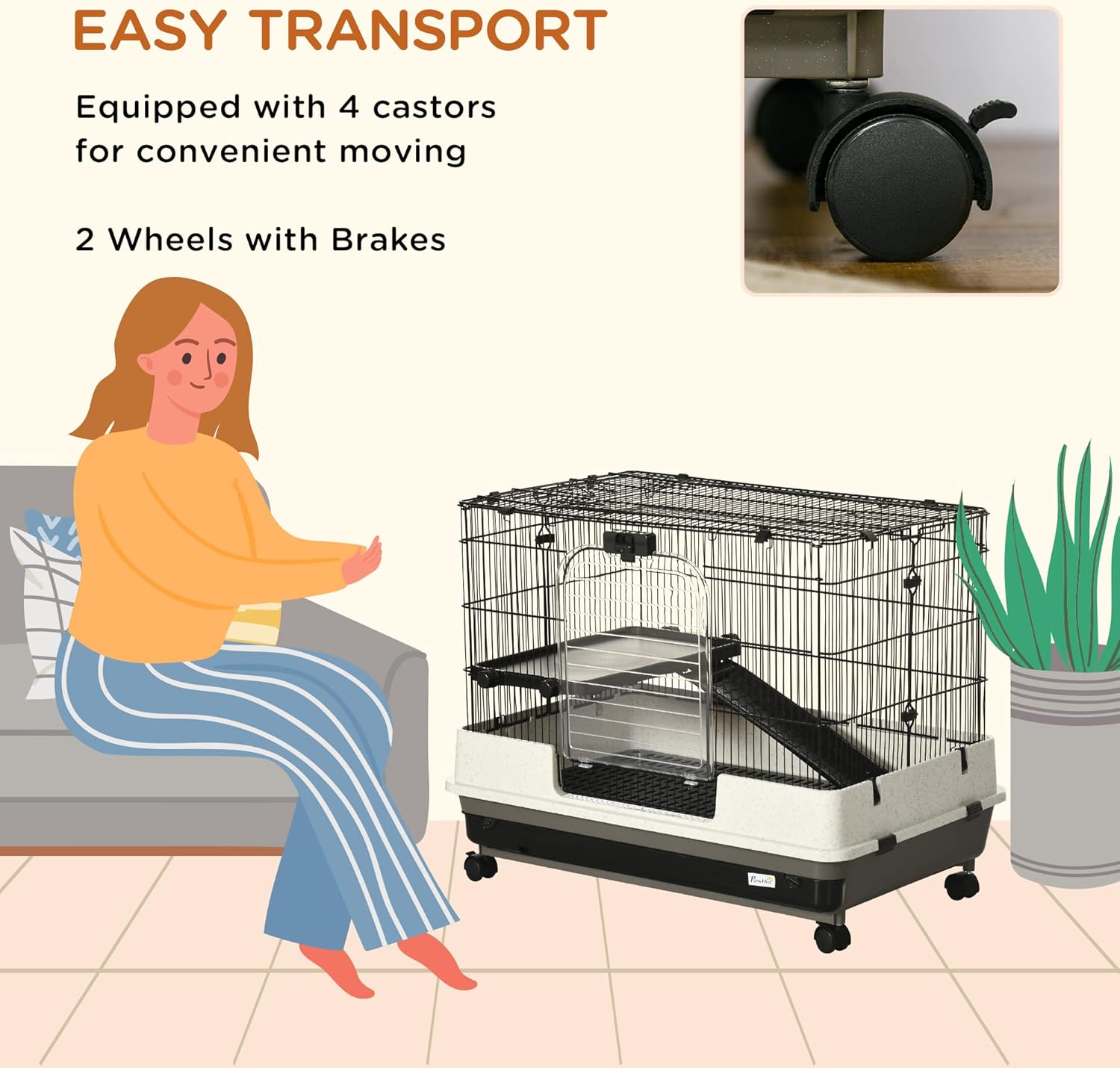 PawHut 26" Small Animal Cage with Wheels, 2-Level Portable Bunny Cage, Chinchilla Ferret Cage with Removable Tray, Platform and Ramp