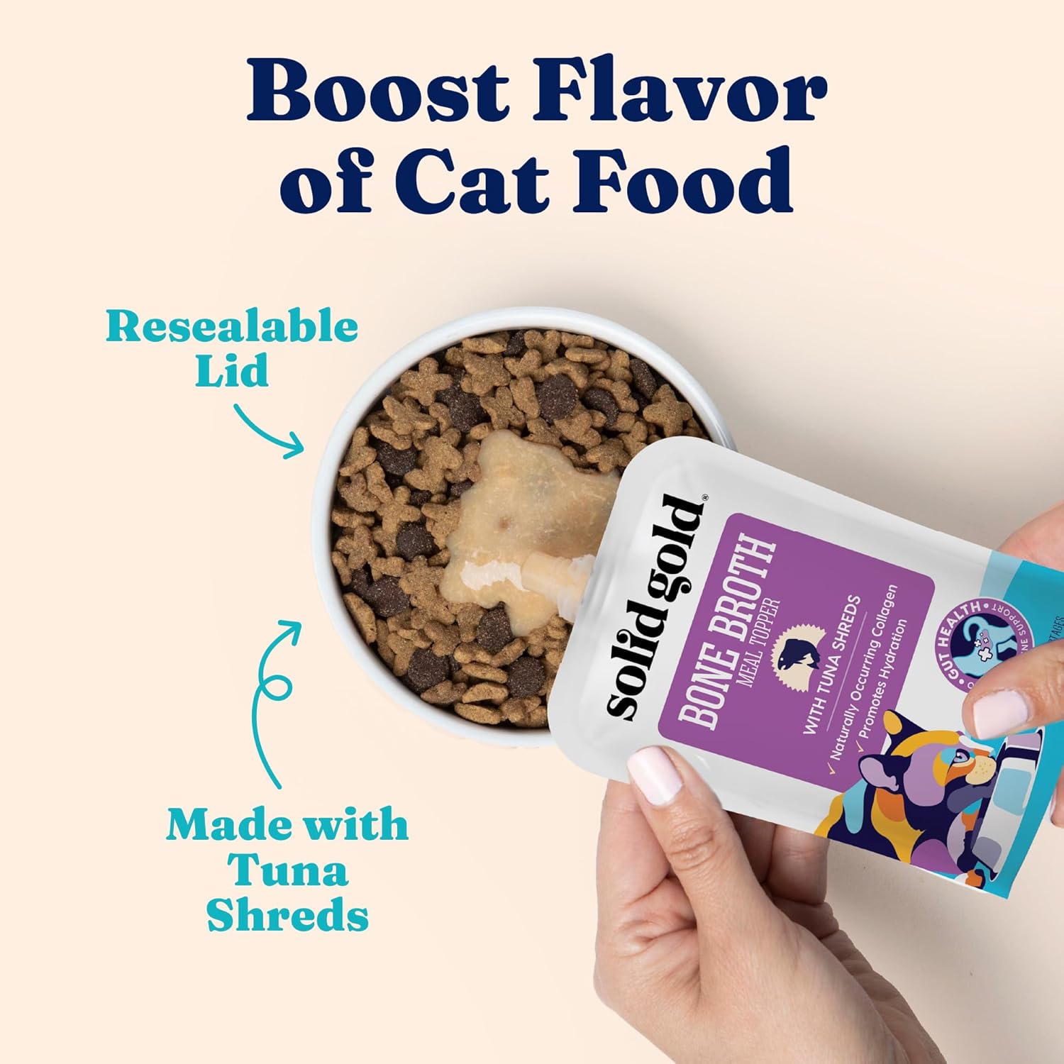Solid Gold Bone Broth Cat Food Topper - Limited Ingredient Lickable Cat Broth Pouches w/Tuna Protein Shreds & Collagen for Hydration & Gut Support - Easy to Serve Gravy for Cats Meal Topper - 12ct