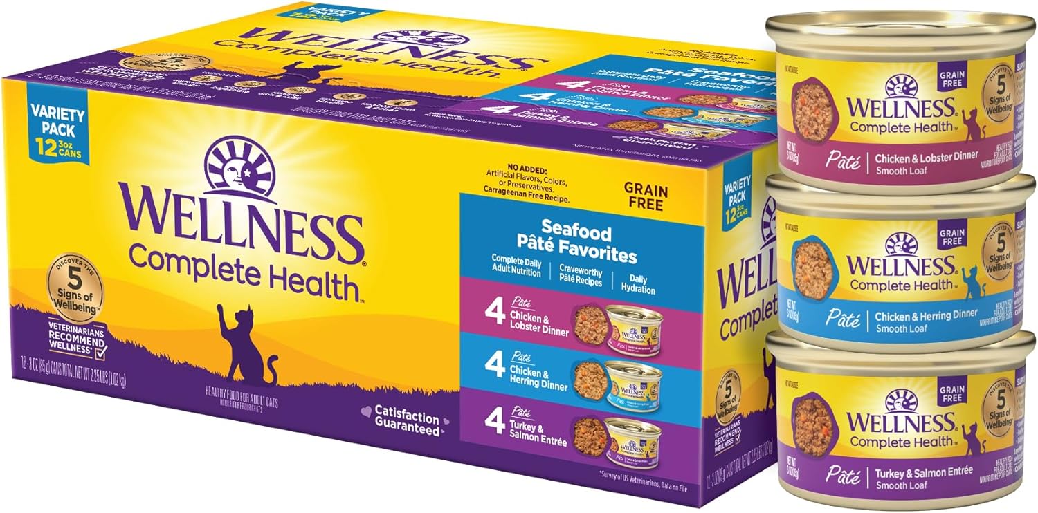 Wellness Complete Health Pate Adult Wet Cat Food, Natural, Protein-Rich, Grain-Free, 3 Ounce, 12 Pack, (Seafood Variety Pack)