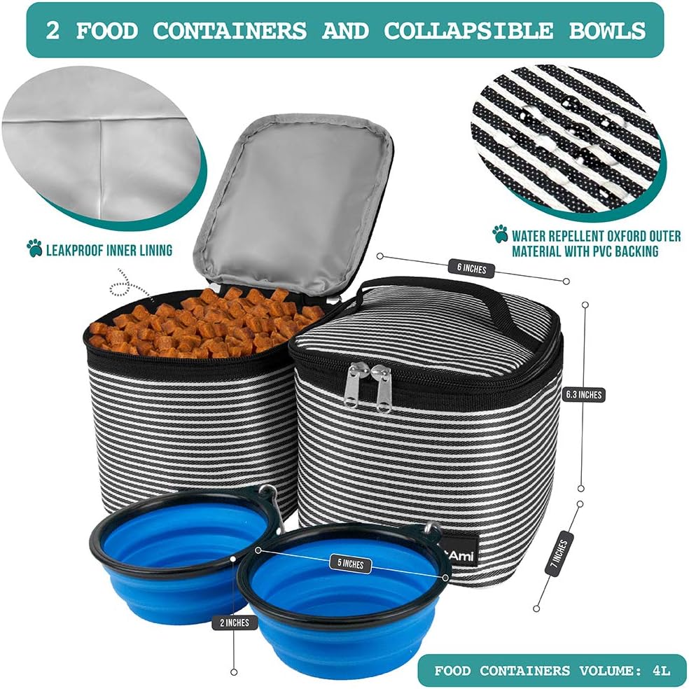 - PET SUPPLIES DOG DIAPER BAG: The dog travel backpack helps dog owners easily organize treats, kibbles, toys, leashes, and all other pet accessories and training supplies. The doggie traveling backpack comes with two food containers and two collapsible silicone dog bowls, ensuring that your pet is well-fed and hydrated during your hiking camping trip. Each food container has a 4L capacity, making it a camping gear must have for all small, medium, and large size dogs and cats.