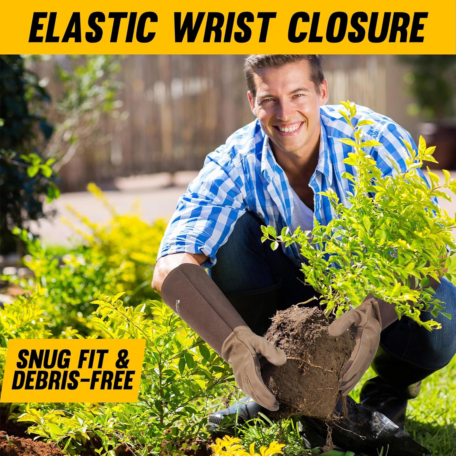 HANDLANDY Long Gardening Gloves for Men & Women, Cowhide Leather Rose Pruning Gloves- Breathable & Durable Gauntlet Glove (Large, Brown)