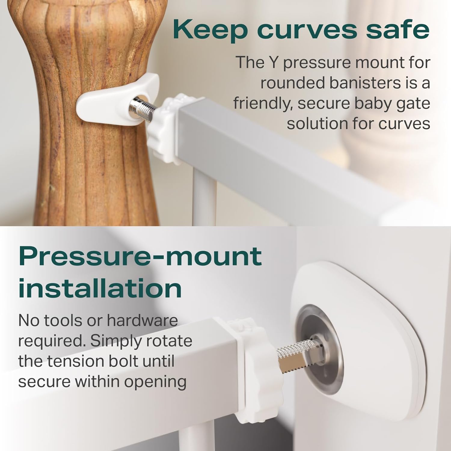 - Easy Installation – The simple pressure-mount system is easy enough for anyone to install in just 10 minutes. It’s perfect for stairs, hallways, doorways, and open spaces. Make sure the installation distance between the upper and lower walls is within 29.7 to 46 inches. (Note: Works with both flat and baseboard walls.)