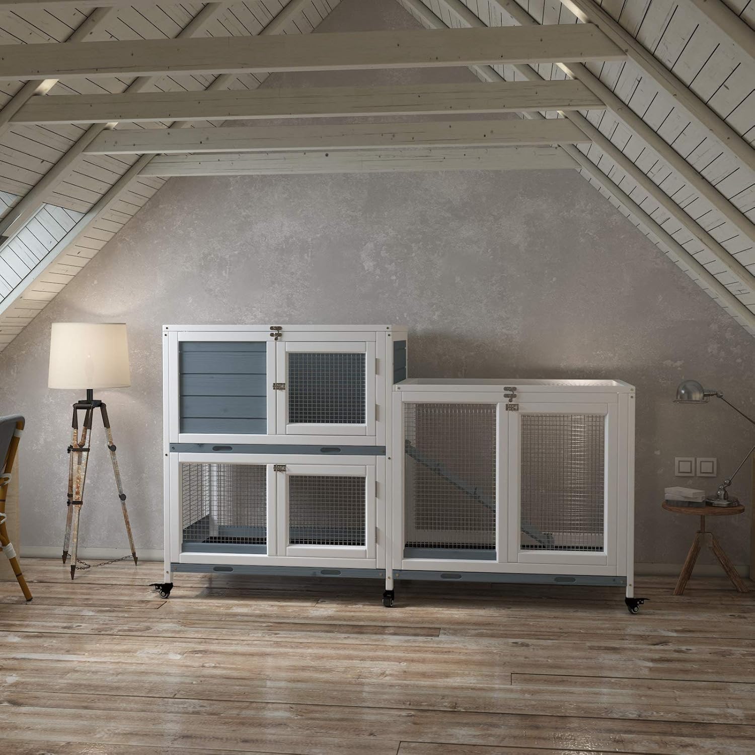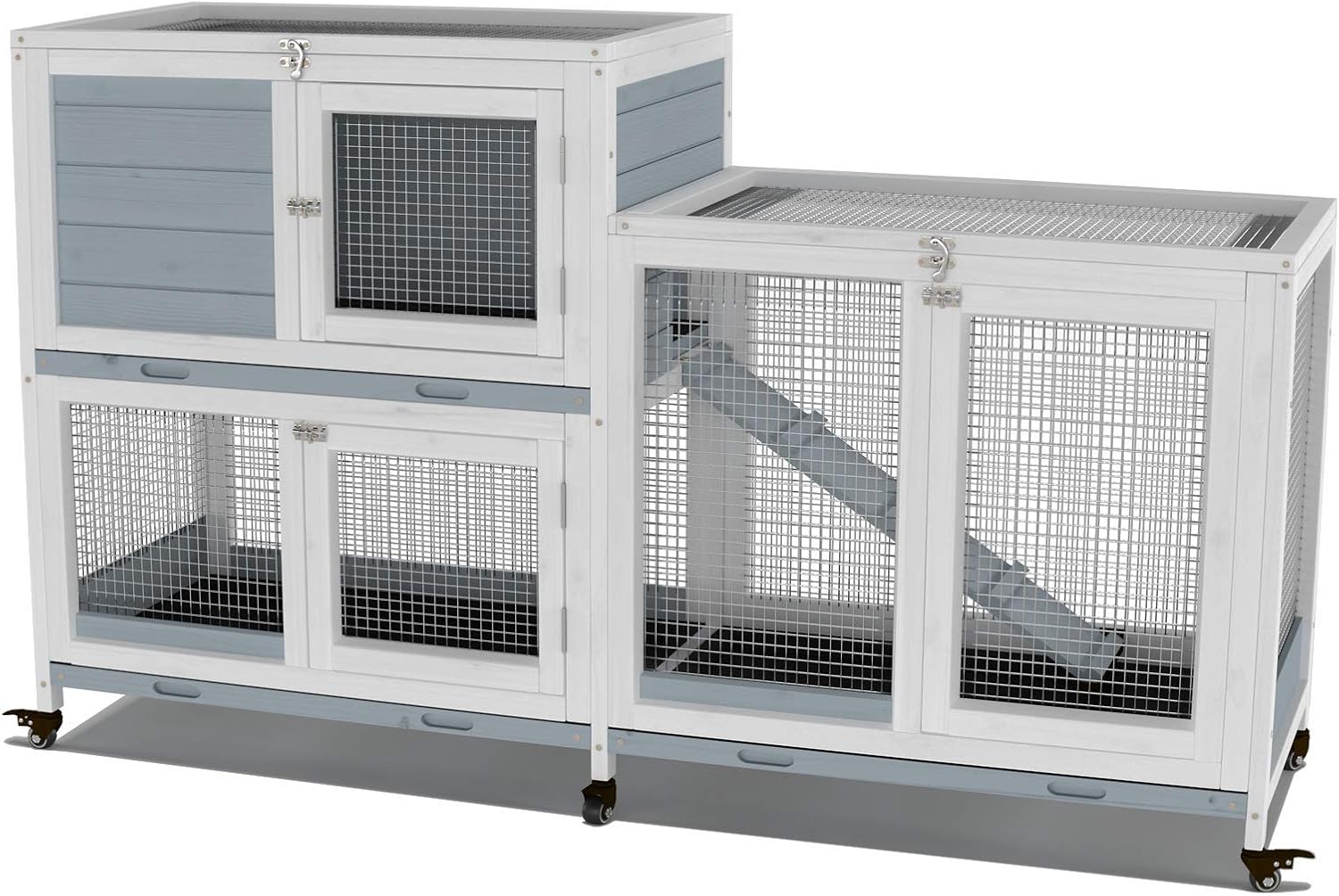 - Bunny House on 6 wheels easily moved as it is on locking wheels for portability and safety . This cage suitable for 1-2 rabbits or 3-4 Guinea pigs or like size animals .Overall Size: Exterior :58.0"(L) x 18.0"(W) x 30.3"(H)