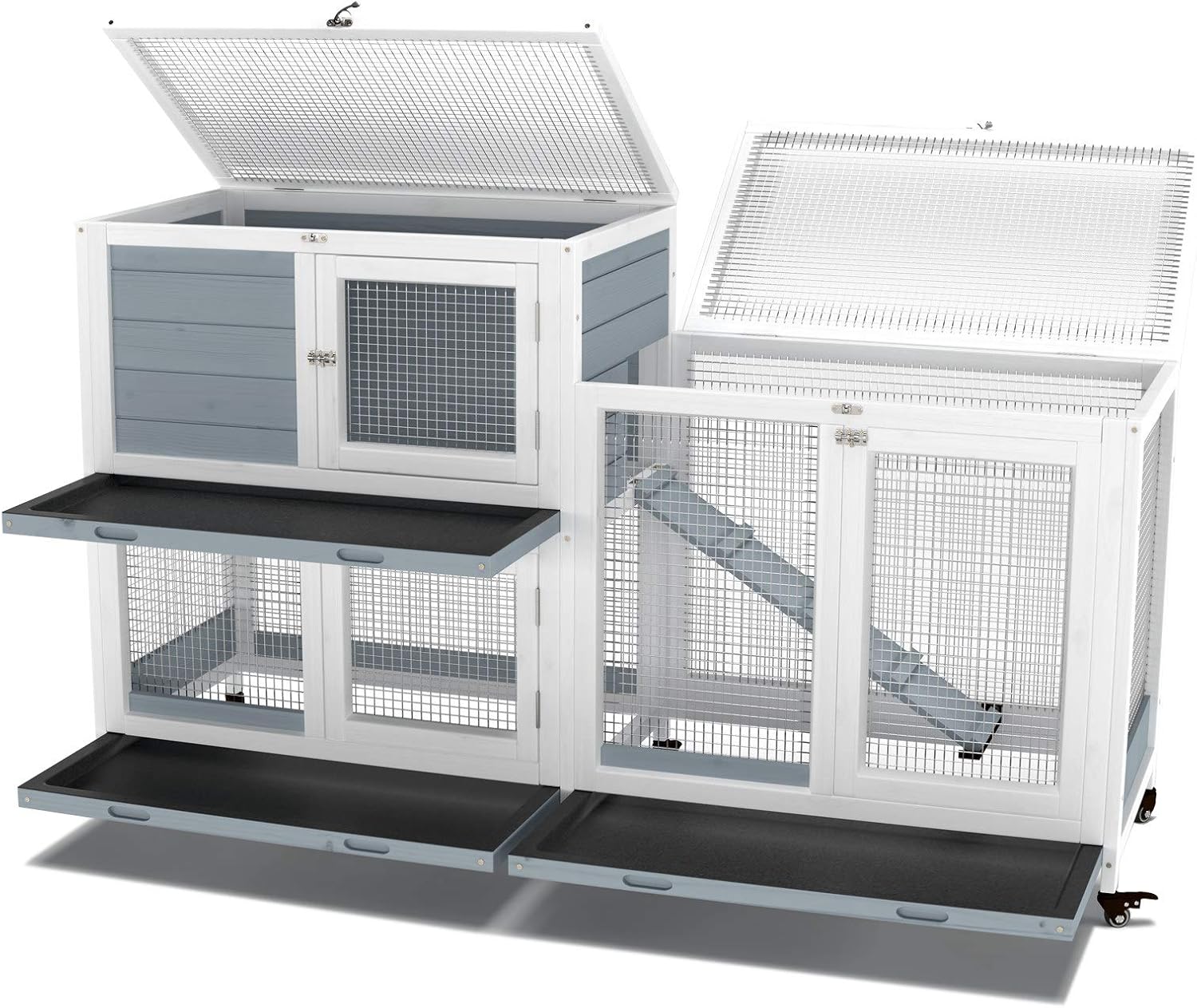GDLF Two Floors 58" Wooden Indoor Bunny Hutch Rabbit Cage on Wheels Guinea Pig PET House for Small to Medium Animals Waterproof No Leak Tray