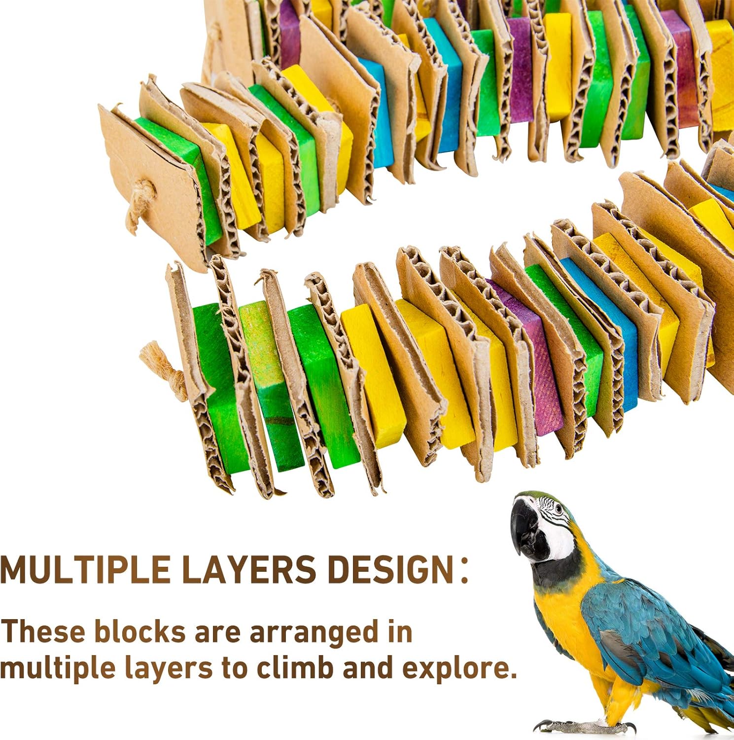 - 【KEEP YOUR BIRDS HEALTHY】--Parrot's beak keeps growing. It will affect the ability of the parrot to eat and damage its health if the beak is too long and not sharp. Our bird toy is suitable for chewing and gnawing, which can keep your parrot's beak shaped, helping them grow healthily.