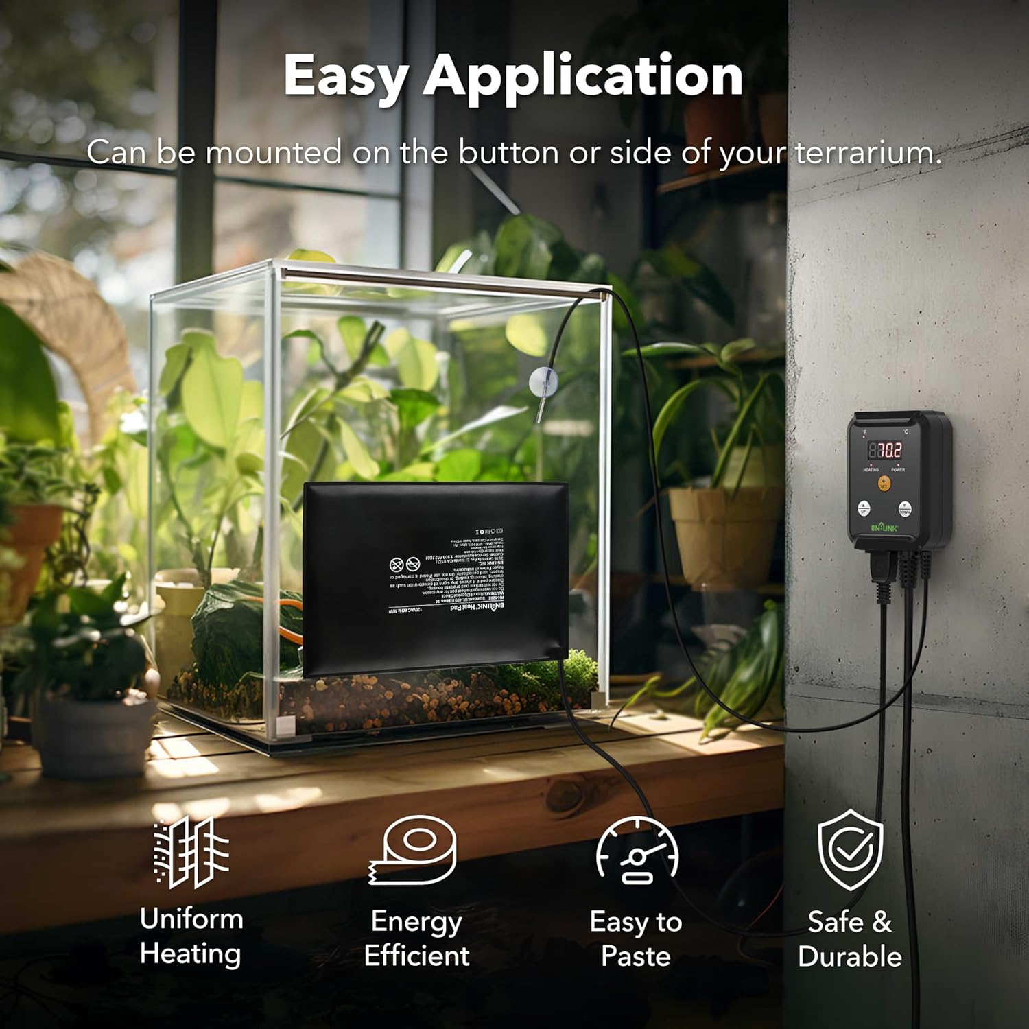 - [CONSISTENT HEATING]: The BN-LINK Durable Reptile Heating Pad provides consistent, uniform heating at temperatures around 104°F to 122°F (40℃ to 50℃), which are the perfect temperatures for reptilian species. Suitable more for 30-45 gal tank.