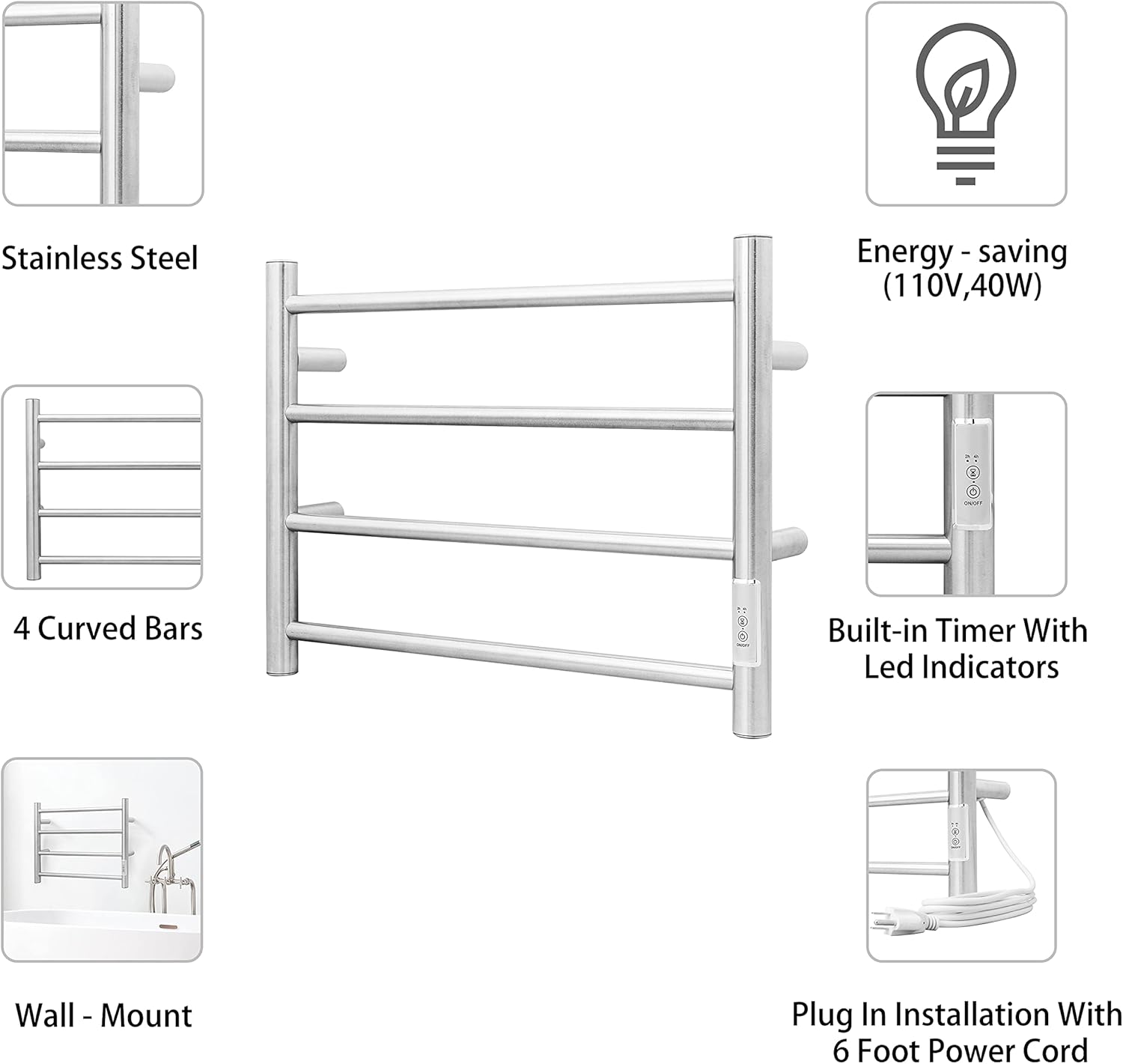 KEG Towel Warmer Wall Mounted with Built-in Timer 4 Bars Electric Stainless Steel Heated Towel Racks for Bathroom, Hot Plug-in Bath Towel Heater Brushed Nickel