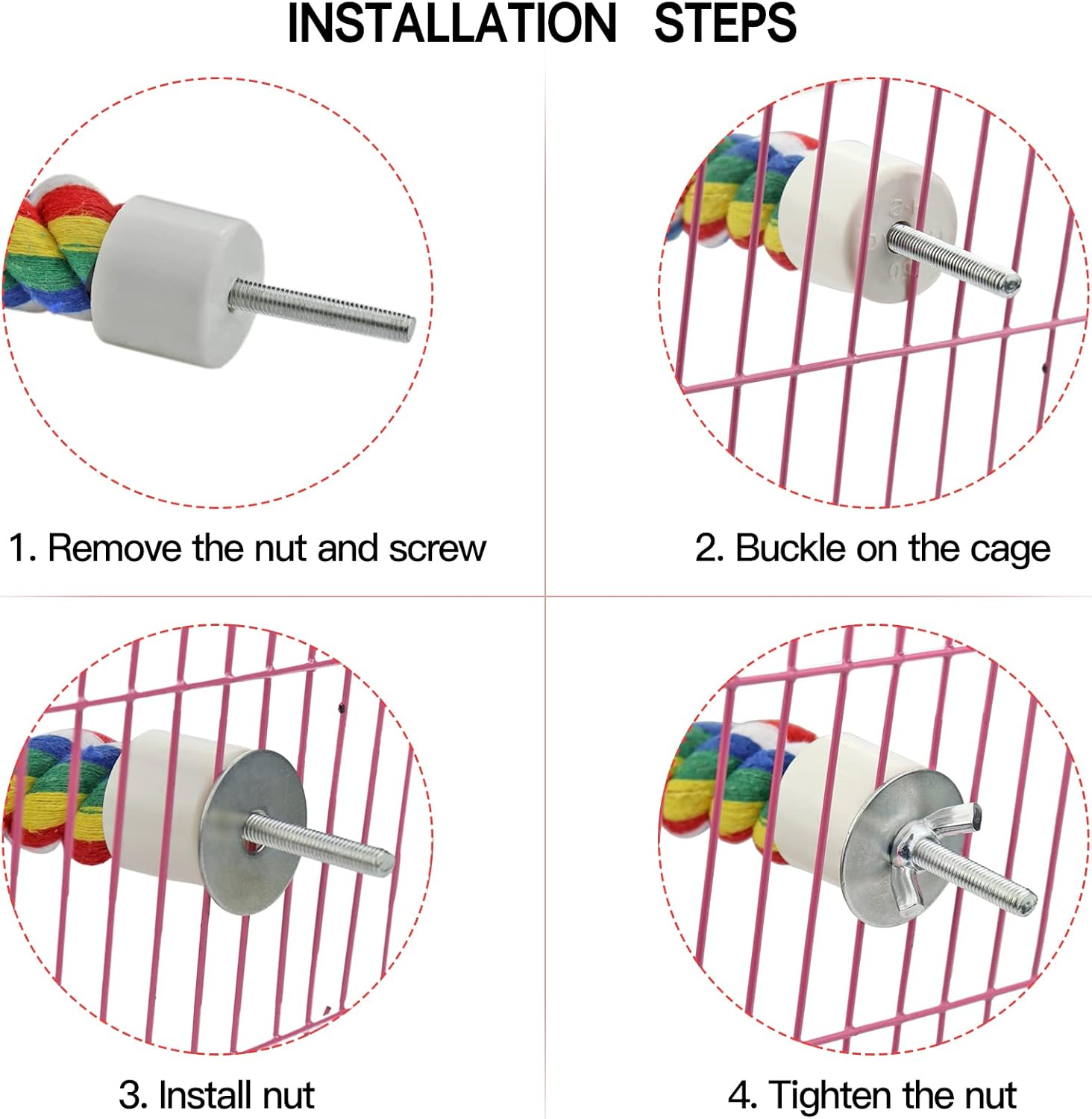 - Disassemble and Installation:Unscrew the nuts at both ends of the bird rope, adjust it to the desired shape, fix it on the bird cage according to the picture instructions, and finally tighten the nuts