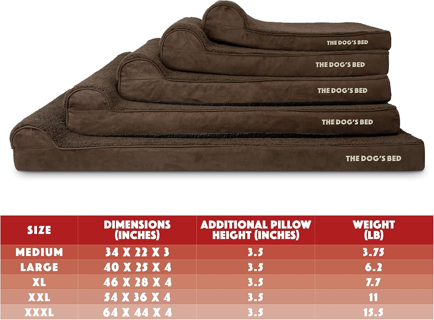 - Amazon's LARGEST DOG BED - XXXL Brown Plush 64” x 44” x 4” (+3.5" Headrest) waterproof orthopedic headrest dog bed. Solid 2” high density, orthopedic memory foam over a solid 2” base of high stability support foam with covers designed so that your bed fits your home decor seamlessly and your dog can stay close to your family