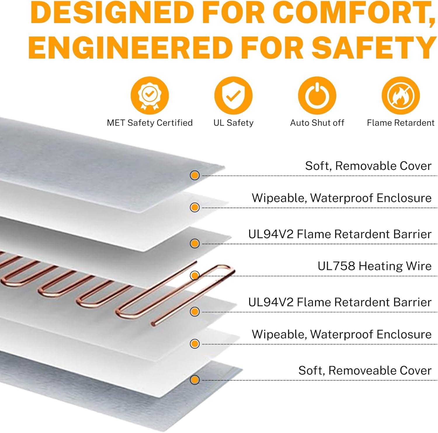 - Built for durability and safety with a machine washable cover, UL-recognized heating wire & 7-layer protection to prevent burns and overheating.