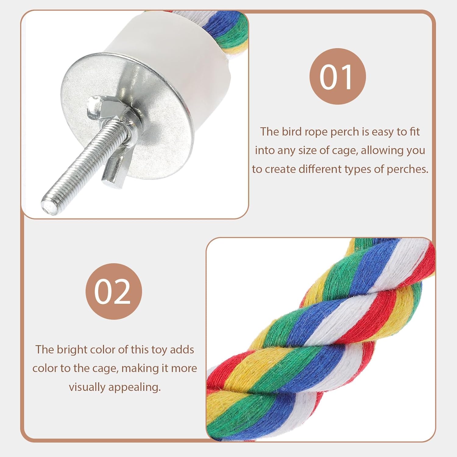 - Removal and Installation: Unscrew the nuts on both ends of the bird rope to adjust it to the desired shape, then follow the picture instructions to fix it to the bird cage and finally tighten the nuts. Simply unscrew the nuts when removing and you will have a parrot leash that will bring happiness and health to your parrot