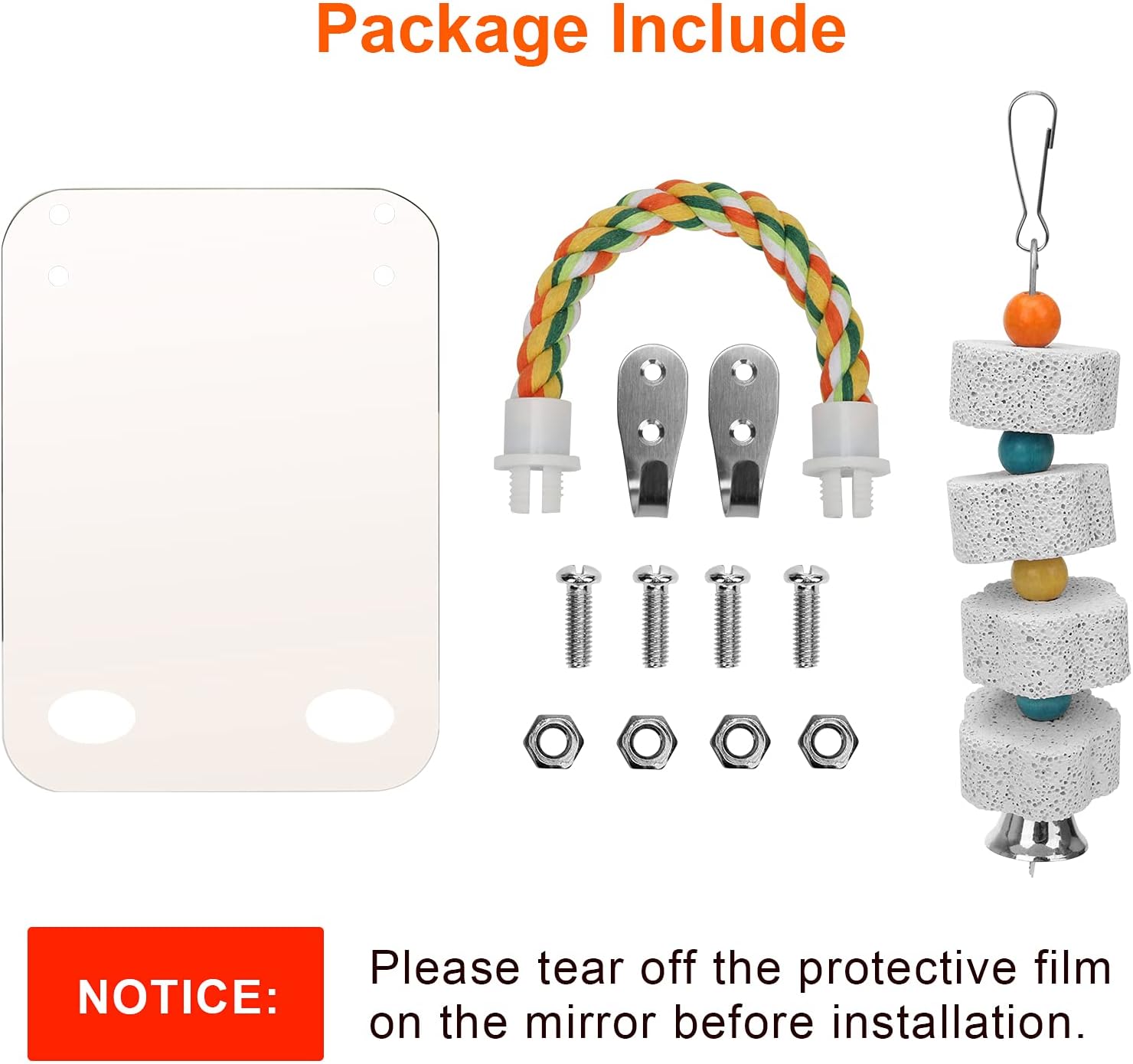 - 【Material】Bird cage mirror is made of acrylic, safe and durable, will not harm your bird, with a cotton color bird rope perch chewy and comfortable. Note: Please tear off the protective film on the mirror before installation.