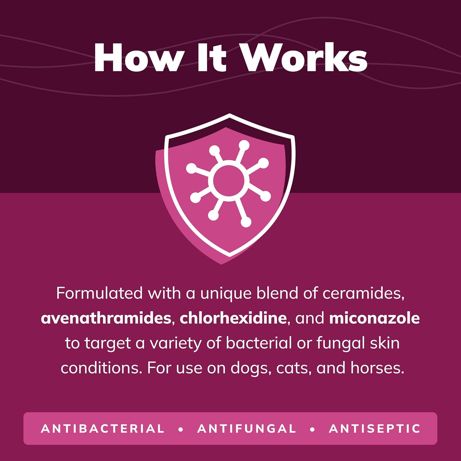 - Contains chlorhexidine and miconazole for antiseptic activity on the skin