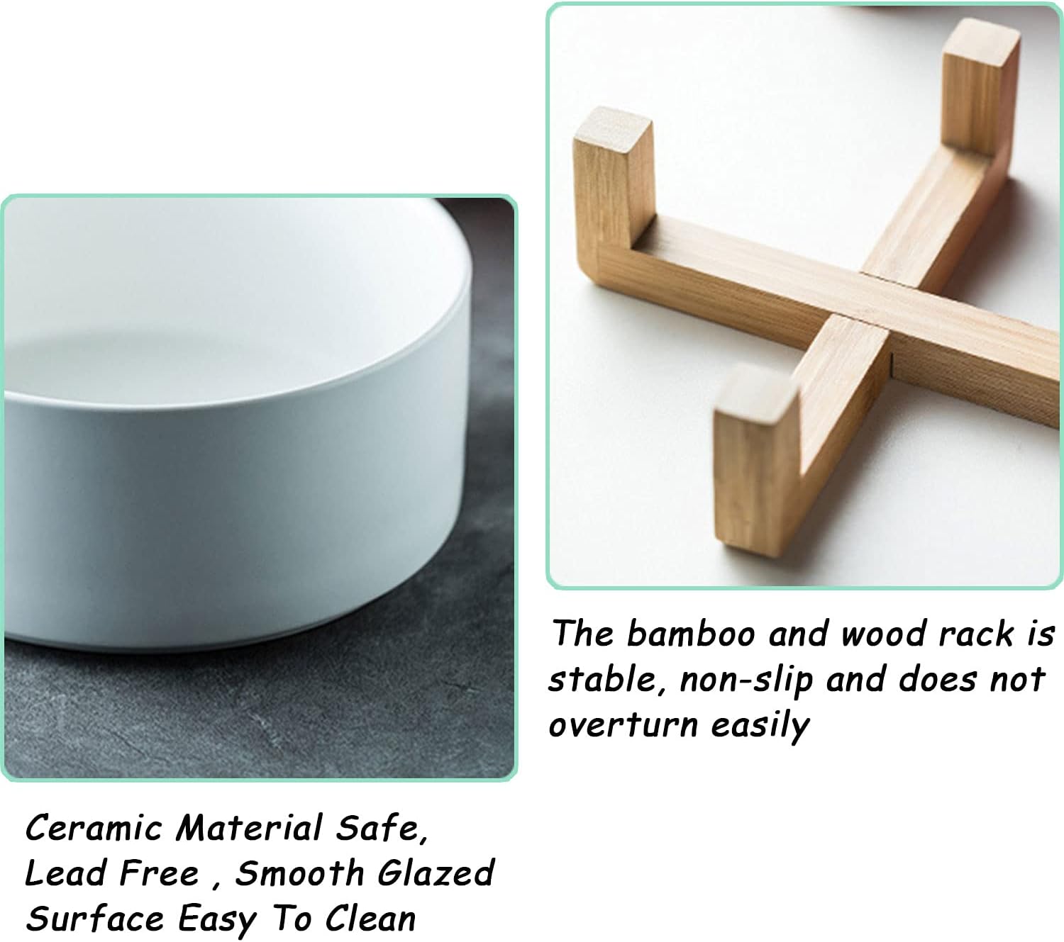 - EASY TO CLEAN CERAMIC - This easy clean dog bowl set is dishwasher proof, as well as easy to handwash and wipe down. With thick walls, these ceramic bowls for pets are sturdy, weighty yet not too heavy. Double Bowl Design:One dog bowl for food and one for water, Each ceramic cat bowl has a Unique wooden stand, raising the dishes closer to your pet for more comfortable eating