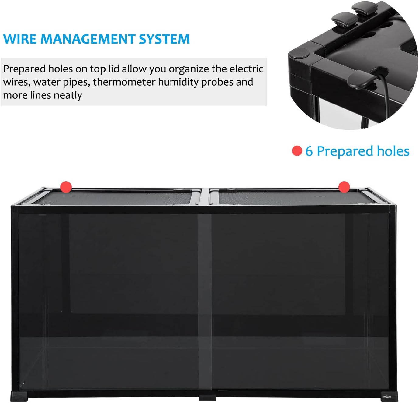 - 【Tempered Glass & Aluminum Frame】High quality tempered glass bottom base and aluminum alloy frame ensure this reptile terrarium is sturdy and safe. Raised bottom 0.5In in order to fit a substrate heater underneath, and waterproof bottom can be used as desert terrarium or rainforest tank.