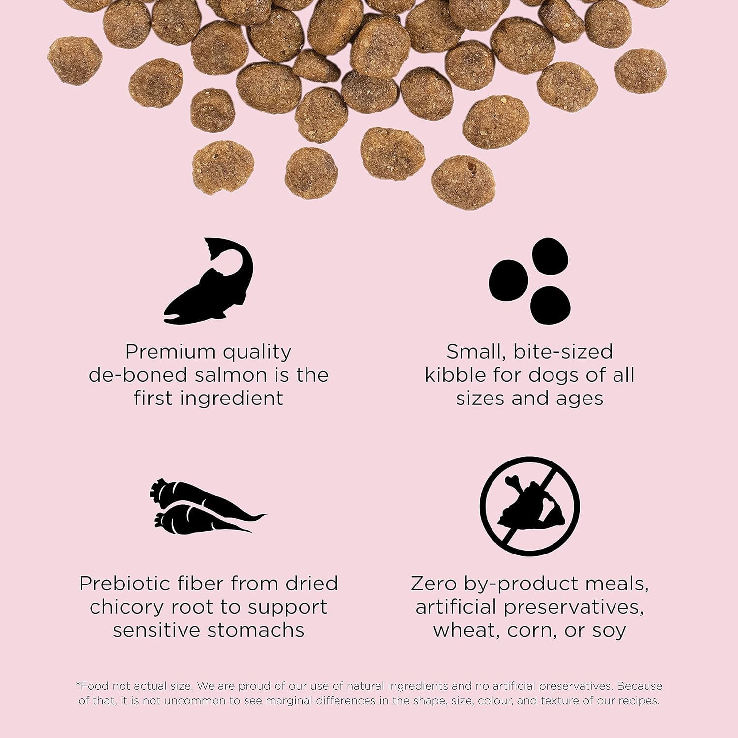 - SMALL KIBBLE: formulated for dogs who prefer a small-sized kibble diet. Our Small Bites Salmon recipe is ideal for little mouths or as a complete + balanced healthy training treat.