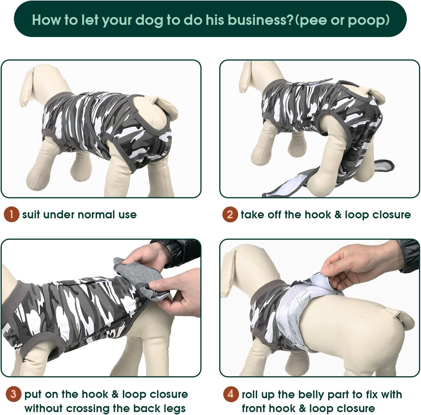 - Easy to Wear: When your dog needs a bathroom break, remove and secure the tapes with provided instructions, aiding wound recovery. Made from machine-washable materials, it's completely safe for your pet