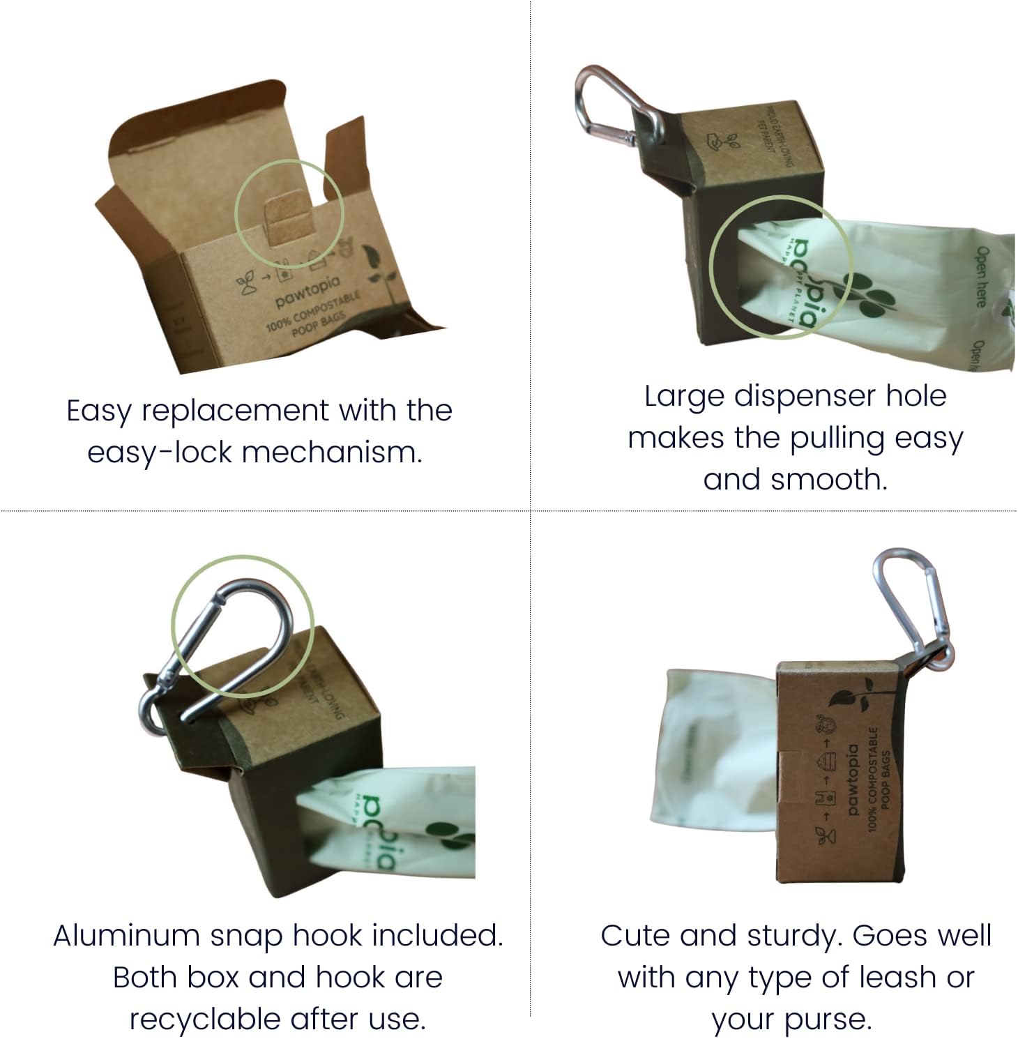 - Purely compostable dog poop bag (120 bags, 8 rolls, Paper Dispenser): Pawtopia supports sustainable living and does not harm the environment (unlike plastic bags). Our biodegradable dog poop bags, made with vegetable starches (corn starch), are 100% home compostable and break down into natural substances such as water, Co2, and biomass. Our biodegradable poop bags are certified with OK Compost Industrial under EN 13432 (equivalent to ASTM6400), and OK Compost Home by Tüv Austria under AS5810/ NF