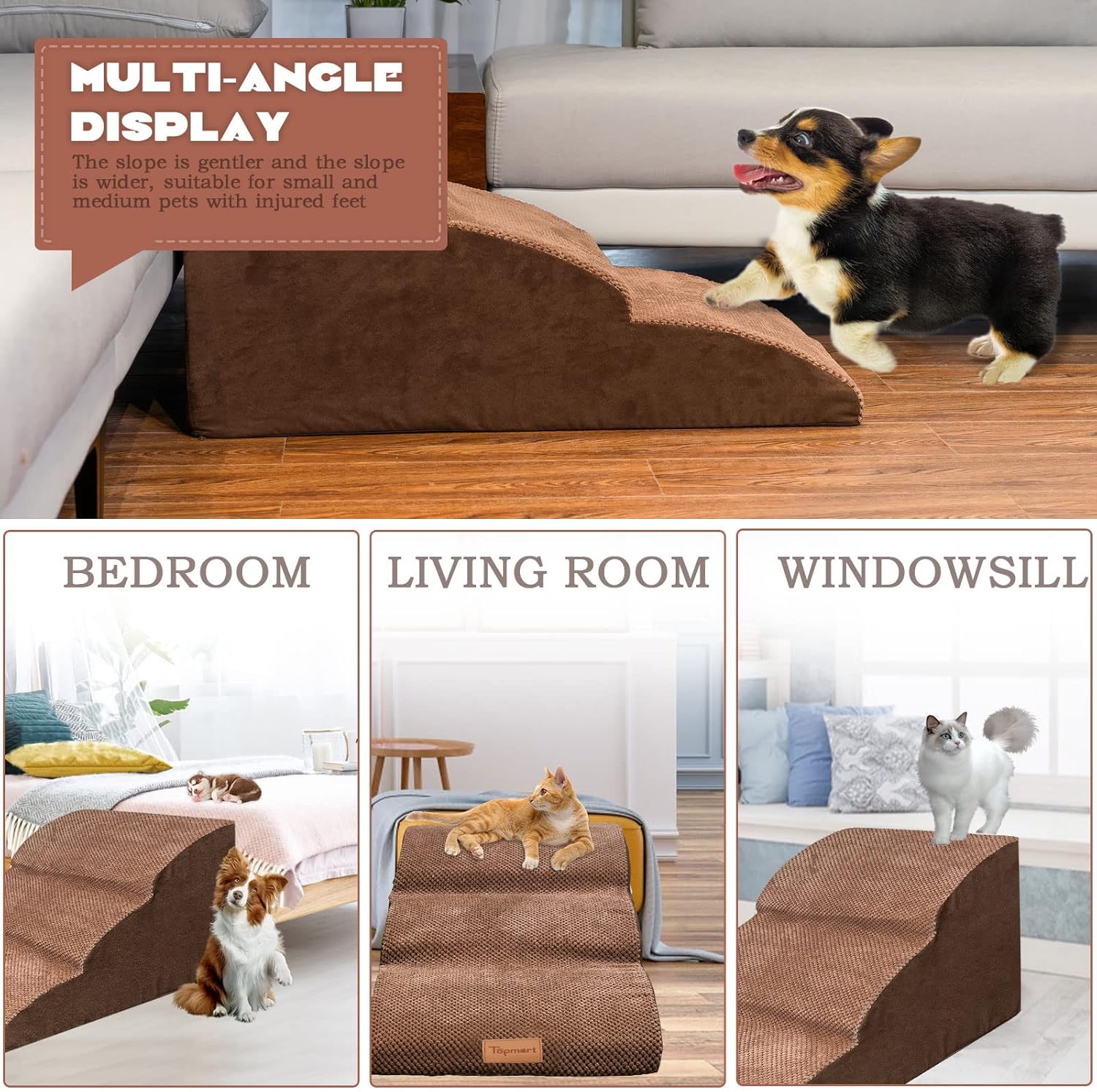- Safer,Wider&Deeper Steps: Our dog stairs are excellent for those older dogs who are less mobile as they age or for cats with injuries. More wide and deep steps are helpful for reducing the strain that constantly jumping up and down onto lower bed,sofa can have on your pet's joints,and topmart dog steps will not shake and slip during use. The cover made of corduroy is more frictional than other covers, pets will not slip on the stairs.