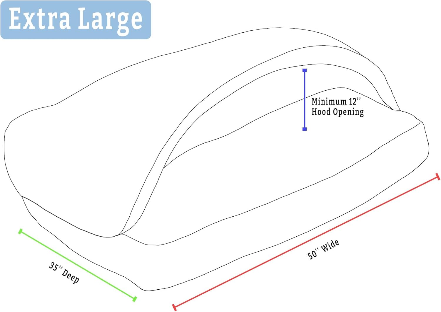 - SIZING: This Extra-Large Rectangle Cozy Cave measures 35” x 50” and has an approximate hood opening height of at least 12”. A thin removable plastic tube keeps the hood open for easy entry or exit and can be removed through the small hole at the corner of the hood for a looser, blanket-like structure. This size Extra-Large creates a snug enveloping feel with enough space for larger breeds or two smaller dogs who prefer to snuggle.