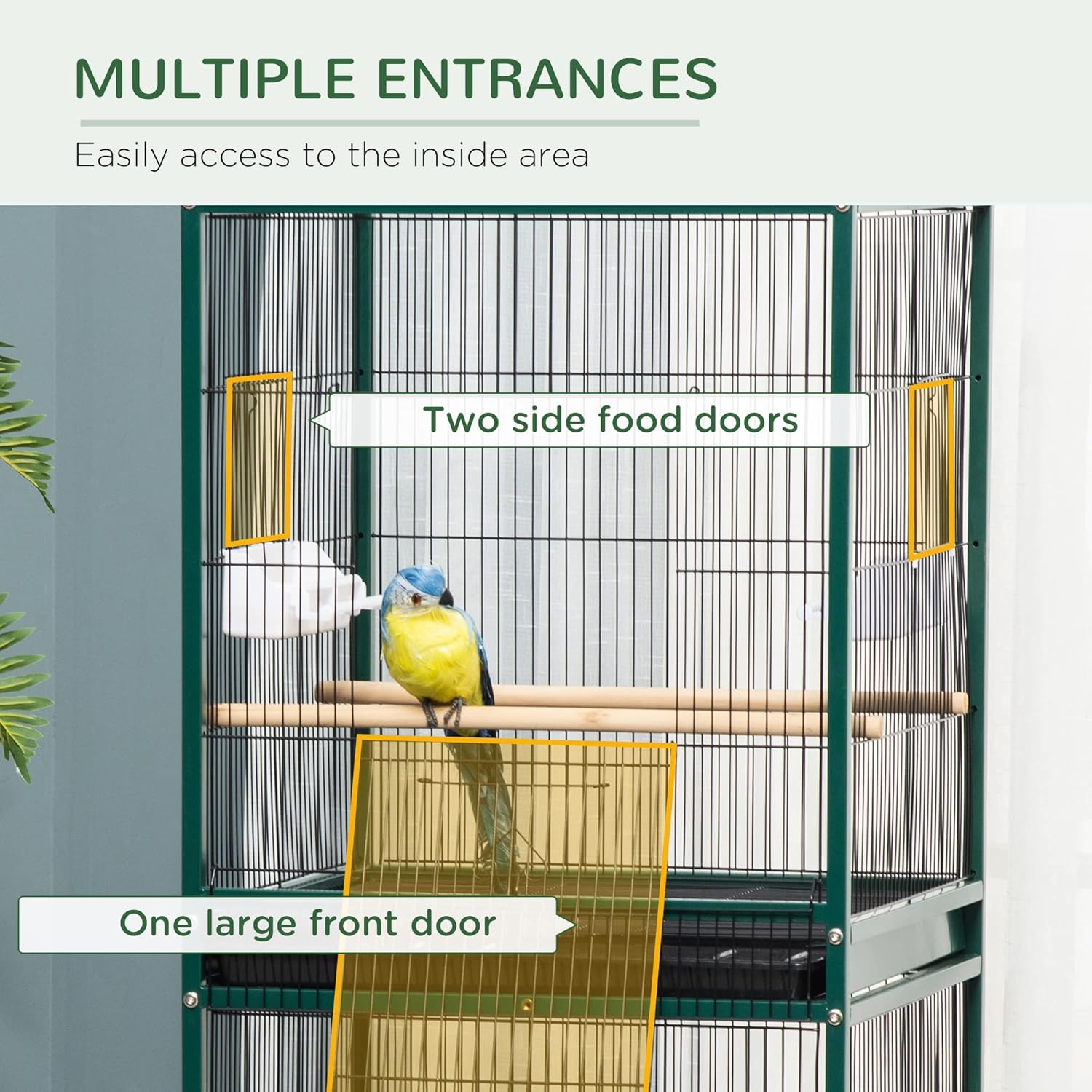 - Four Doors: This steel bird cage has a large front door, a small front door, and two side doors, offering multiple places to easily access food, water, and the inside area. Reach in from whichever side of the cage you're coming from to save time when on the move and feeding them quickly, either in the morning leaving for work or school, or when leaving for a day out. The quick access to the cage allows convenience.