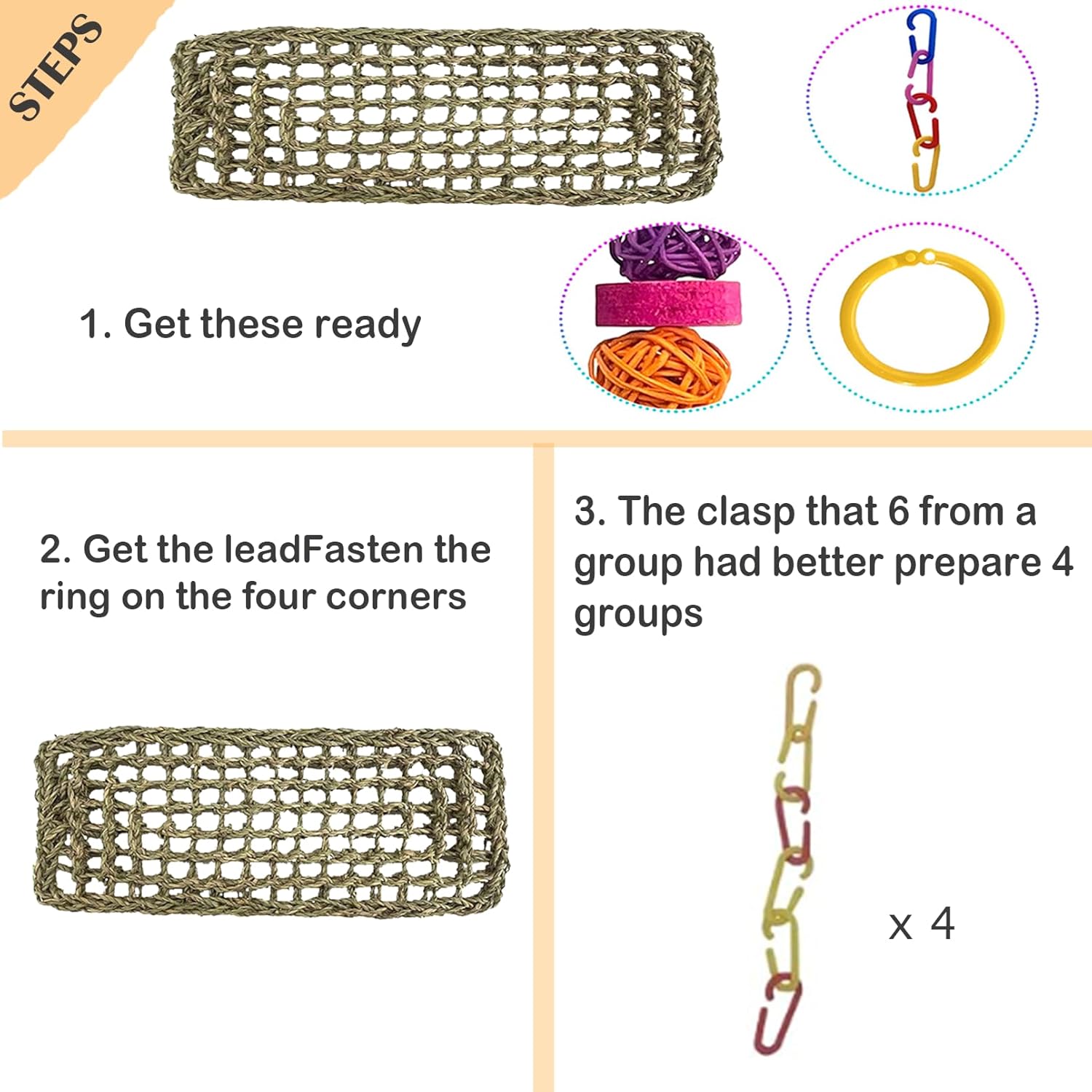 - 【QUALITY SAFETY】Bird seagrass mat is made of natural seagrass handmade woven.seagrass fiber material,soft but very sturdy and durable,Hanging colour toys can meet the birds' play needs.parakeet seagrass mat is a good parakeet cage accessories