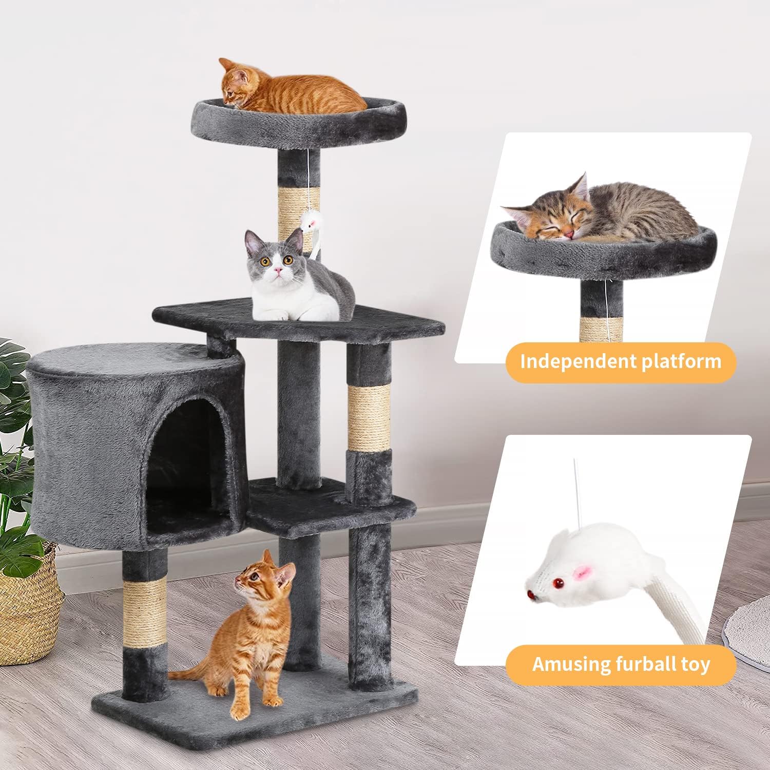 - 😸【Multifunctional Activity Place】The cat house provides one independent platform and a large roomy condo. Whether your kitten wants to stretch out on a spacious perch, curl up in a plush hole room, or release the urge to scratch on a sisal pole, this multifunctional cat tree tower can make your fur baby's day full of fun and excitement!