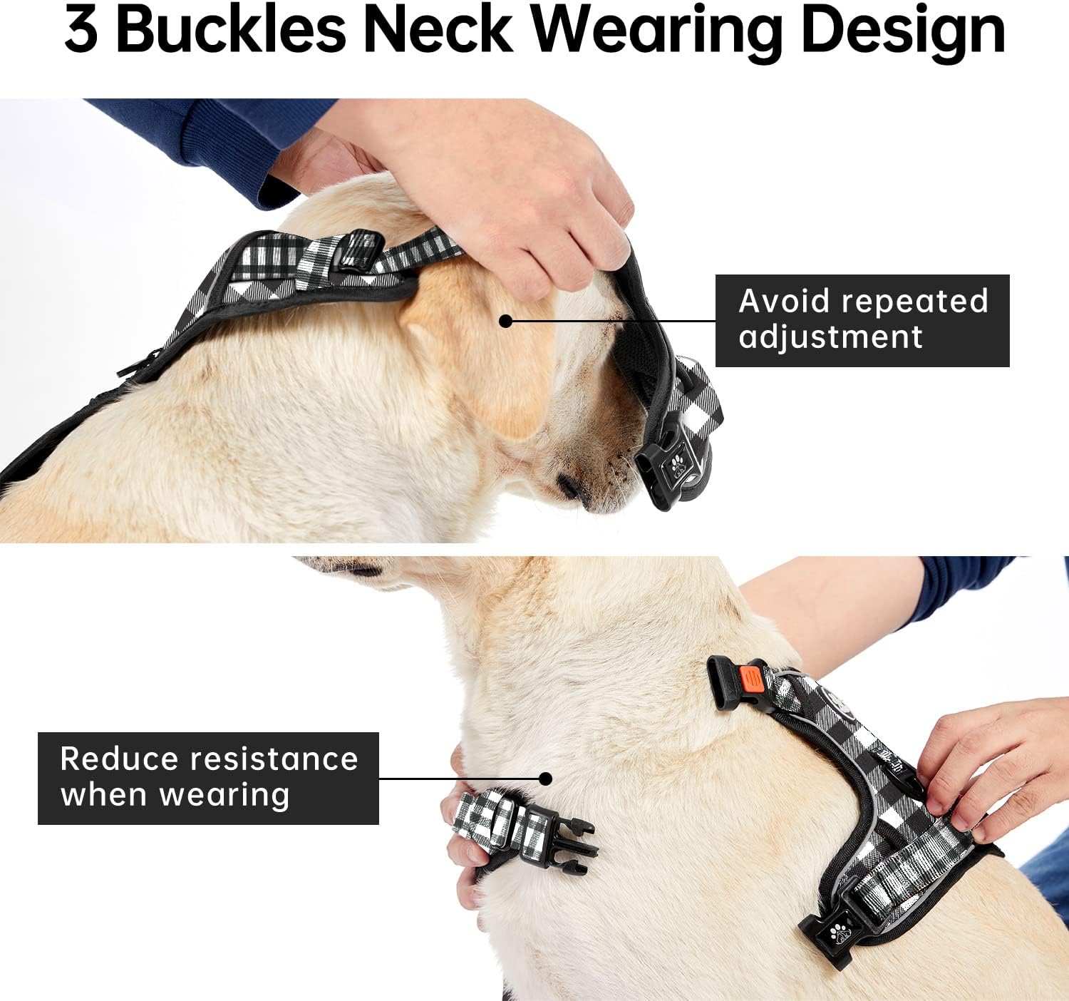 - ≡ NECK WEARING DESIGN ≡ The large dog harness is equipped with 3 buckles on both neck and body position, so you can easily put it on or take it off from the neck side. No more time and effort to put on the harness from the dog's head, and no more worries about hurting your restless dog during the process