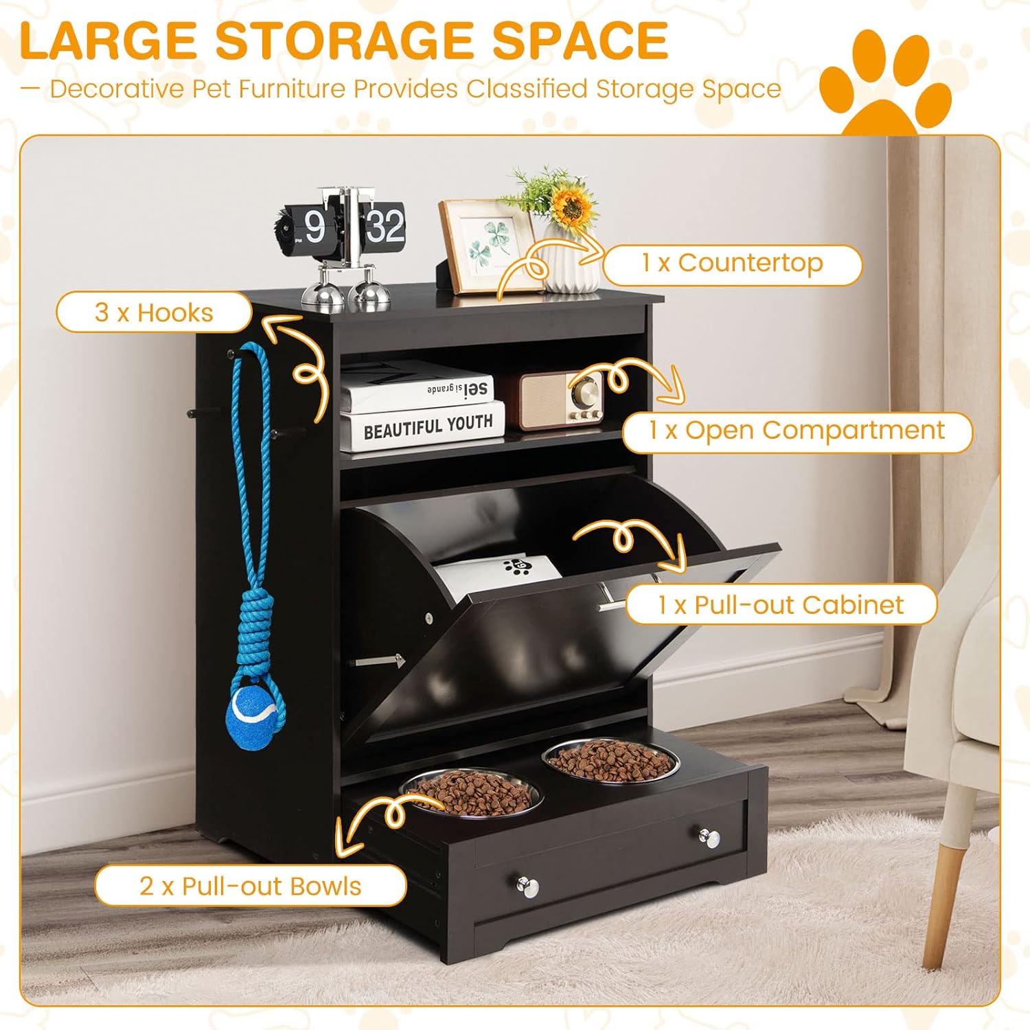 - 【Spacious Storage Space:】The pet feeder station is designed with a wide countertop, an open compartment, a pull-out cabinet, 3 hooks on the side, and a pull-out drawer with 2 dog food bowls, providing classified storage and organization to keep your room neat. You can store pet food, toys, and other sundries for convenience.