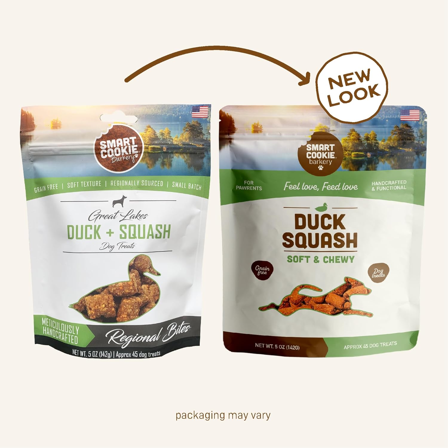 - WORRY FREE REWARDS: Our Duck + Squash Soft Treats are made with human grade ingredients sourced from the gorgeous Great Lakes region. Single animal protein that picky dogs will love; Now you can reward your allergy-prone or sensitive stomach pup!