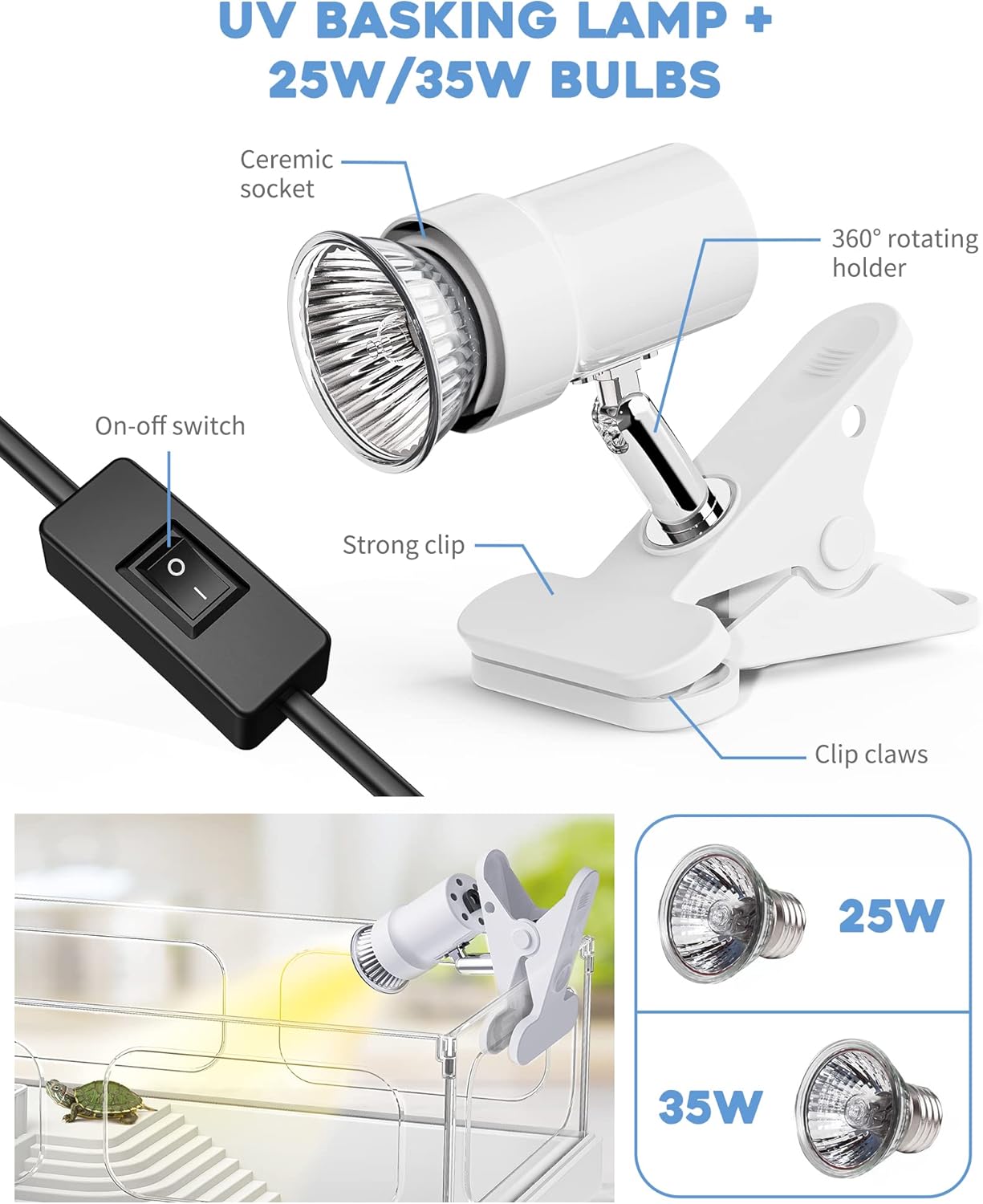 - 【UVA/UVB Basking Lamp + 25W/35W Bulbs】Turtles need to bask in the sunshine everyday 1-2 hours for metabolism, mood regulation, breeding, etc. 25W/35W Bulbs provide best warmth within distance of 10’’ to 15’’. They’re perfect for this small tank, not too hot not too cold.