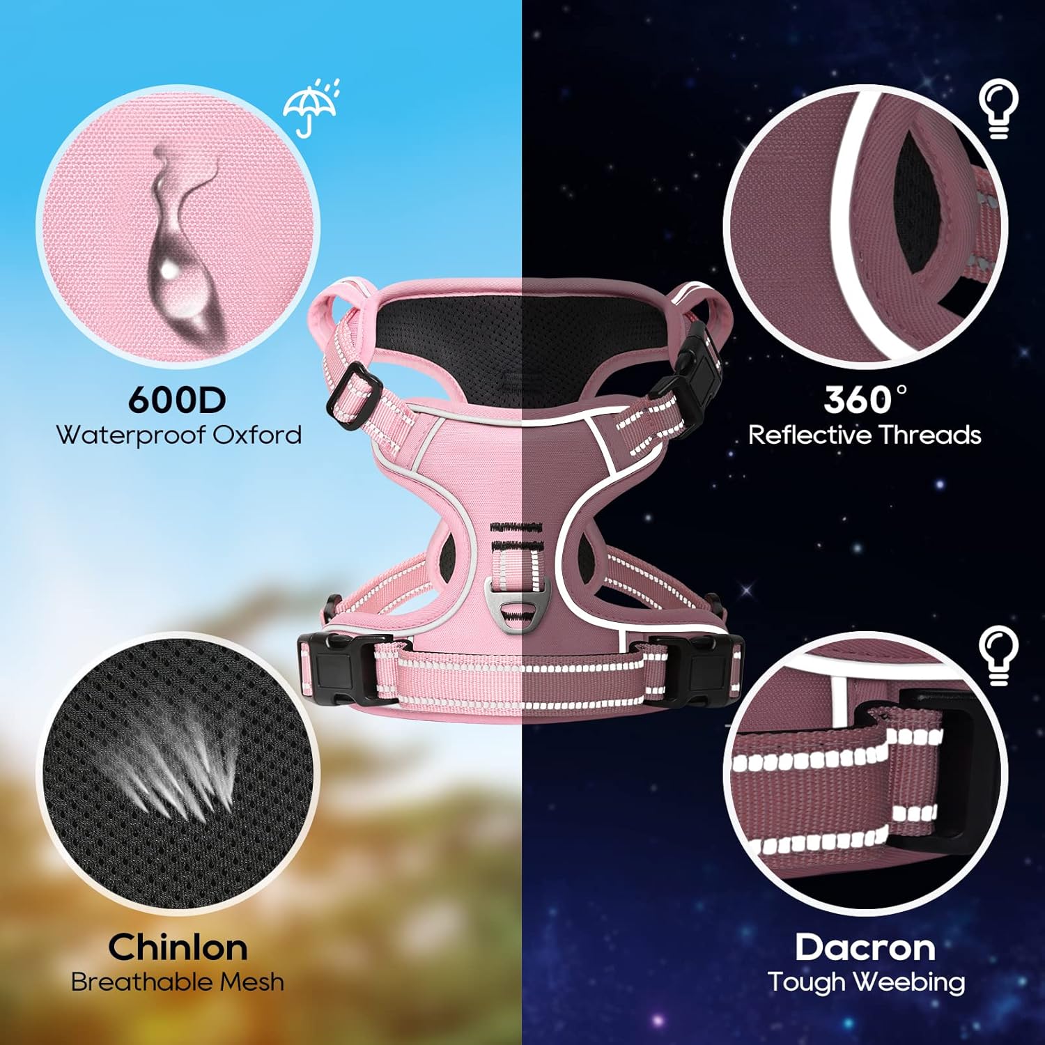 - 【MUCH SAFER & MORE COMFORTABLE】 Breathable mesh lining with soft sponge padding plate of puppy harness prevents injuries, giving extra comfort and protection with enhanced 1600D oxford fabric. The reflective material will be really nice when it gets dark. Also, your dog will be saw easily. This reflective material can make drivers have long time to react, which ensure your dog’s safety!