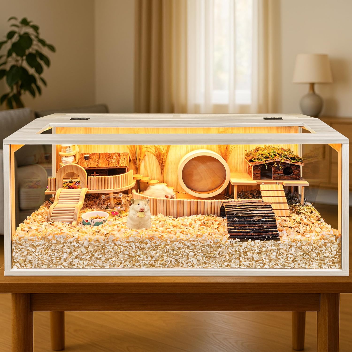 - 【Thick Bedding Matters】Research shows it’s best to have plenty of bedding so your hamsters can make a burrow just like they would in the wild. The extreme large interactive space of our cage is able to hold thick bedding and toy system for your pets to dig and explore. It's easy to arrange their hideout, sand bath area, hamster wheel, or exploring scene in the cage, which results in a far happier and less stressed hamster compare to the wire cage. We offer 4 different sizes, feel free to choose from 24-48in length. Note: The inner decoration is not included in the package