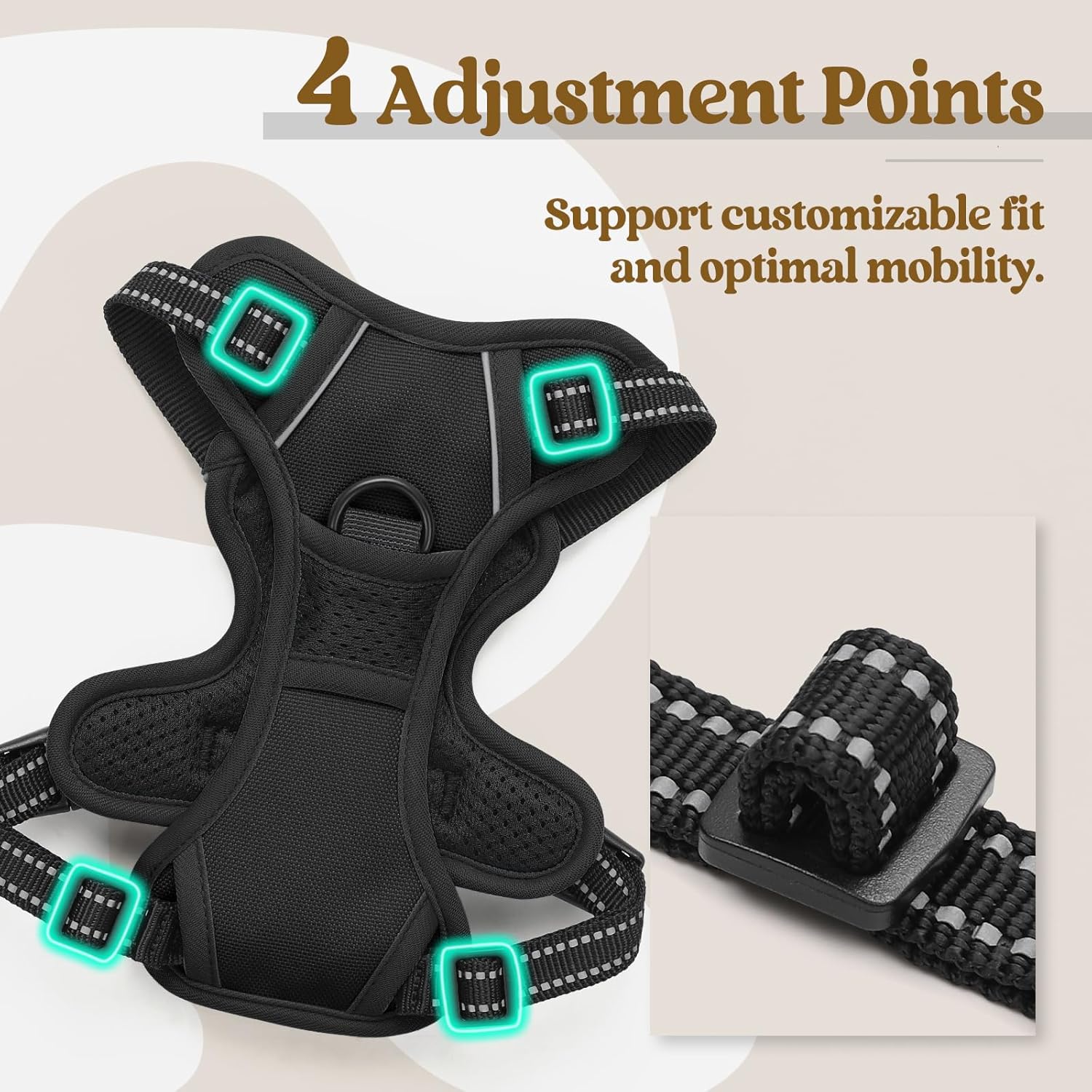 - Fully Adjustable - This adjustable harness features 4 easy adjusting straps around the body. You can use its 2 neck straps and 2 chest straps to create a perfect fit for your dog with some room of growth. No worries about slipping out or choking