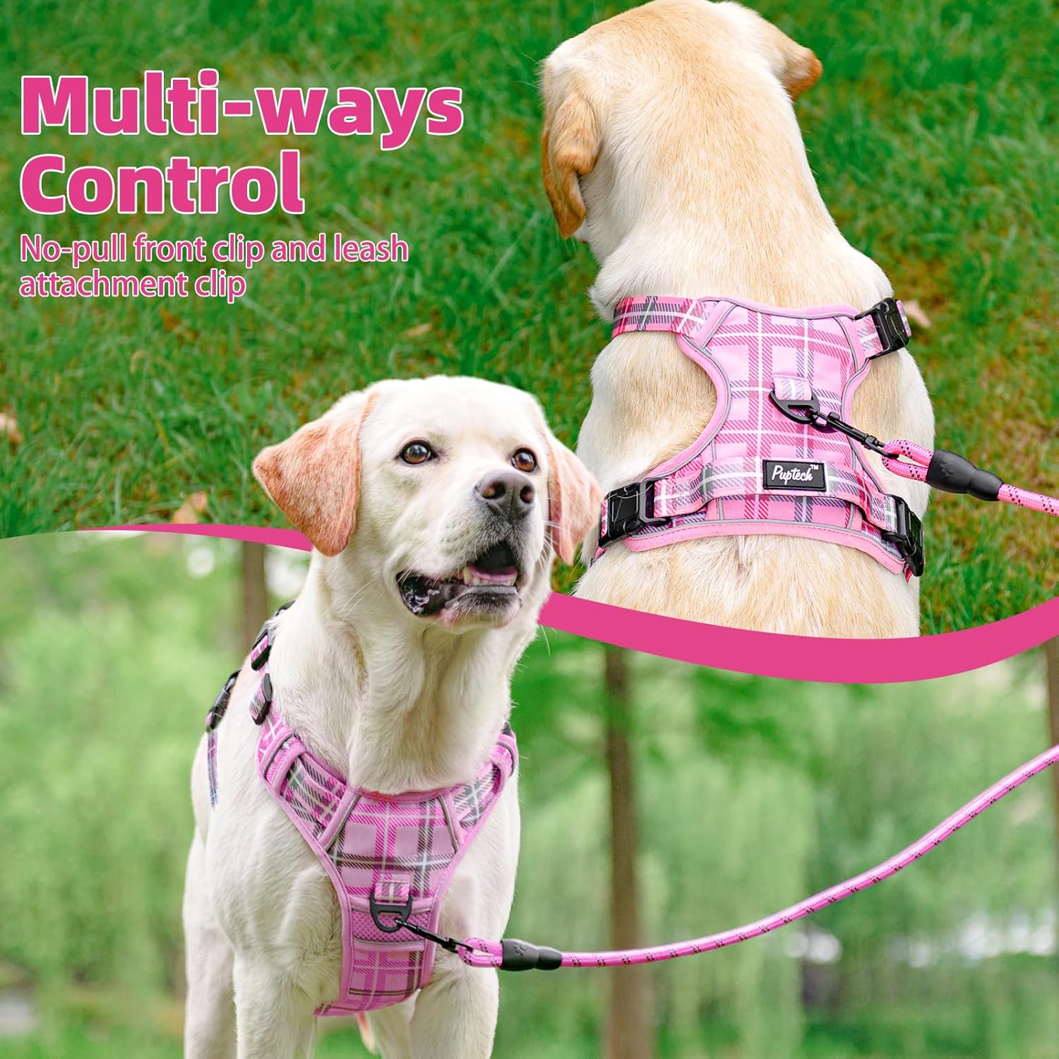 PUPTECK No Pull Dog Harness Small Sized, Adjustable Reflective Dog Harness with Handle Easy Control, Comfortable Soft Padded Pet Vest Harness for Small Dogs, Plaid Pink S