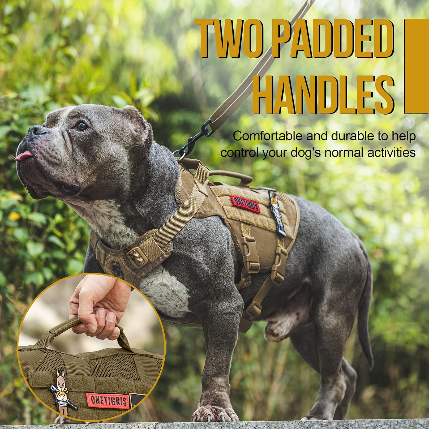 - [Molle/Handles]: Looped MOLLE panel on both sides for MOLLE compatible add-ons such as treat totes, poop bag pouches, service dog kits, military patches and name tags. 2 padded grab handles with reinforced stitchin. Useful for getting in/out of a car, immediate canine control in crowded areas or with other dogs, etc.