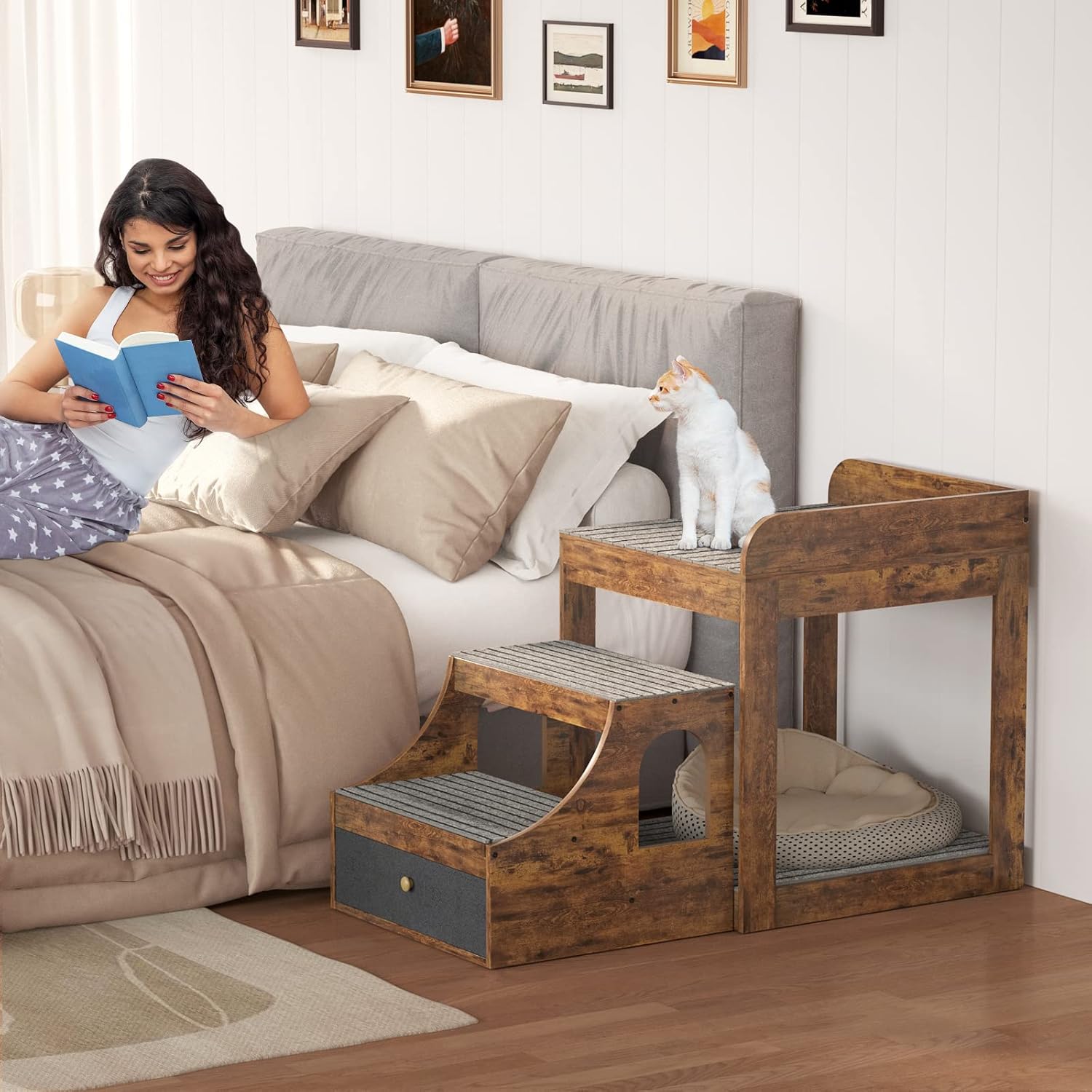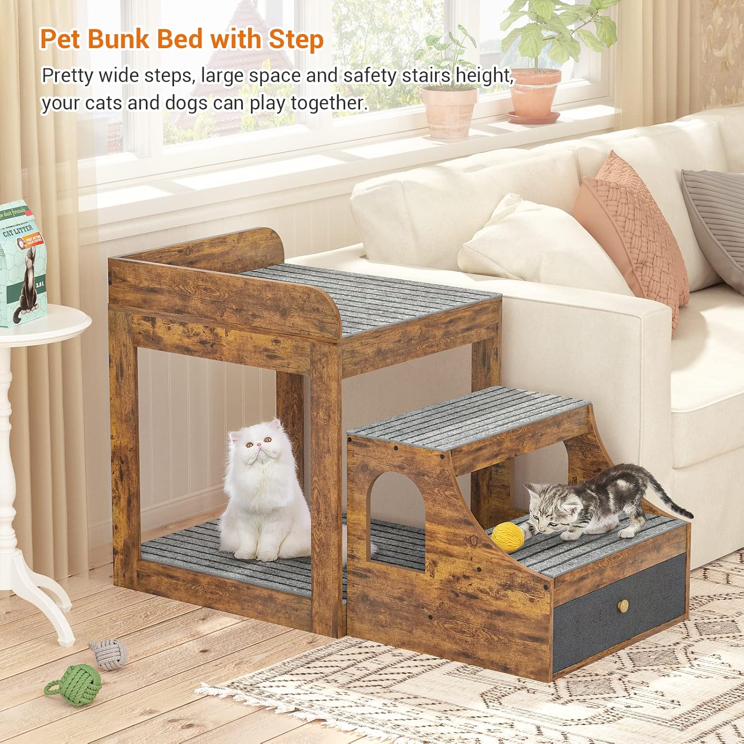 - 🐾 Large Space with a Storage Drawer - The space underneath the bed is large too, so your dogs and cats can play together. The top bed space is 21.65*21.65 inches, providing a safe and large space to lie down and rest. It can hold up to 250 lbs. The drawer underneath the stair is large too, you can install your pet's toys and food too.