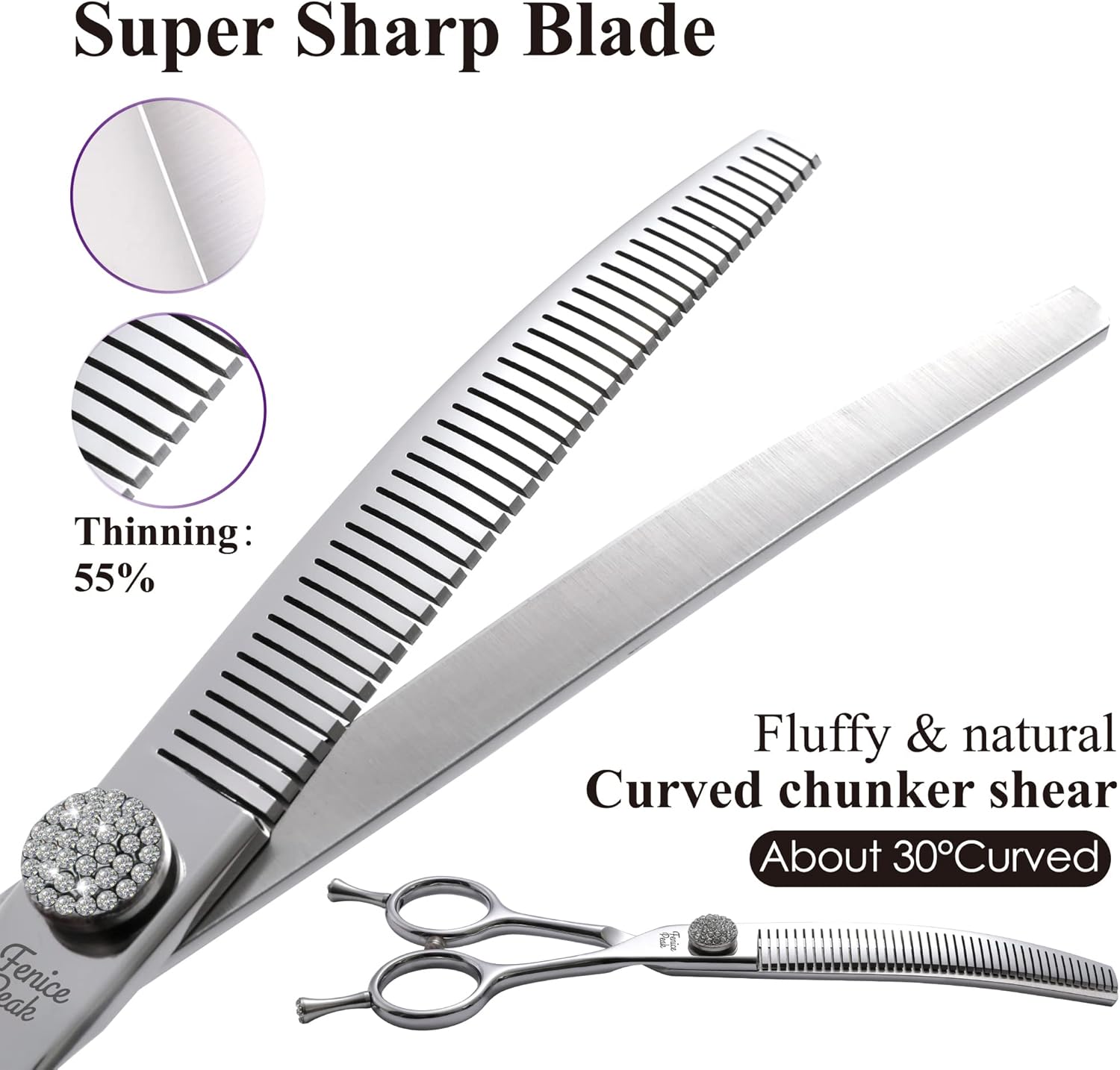 Fenice Peak 7.5‘’ Curved Thinning Dog Grooming Scissors with Jewelled Screw 440C Stainless Steel Pet Grooming Bulking Shears with Symmetrical Handle and Decorative Tail Nails Fluffy Scissors