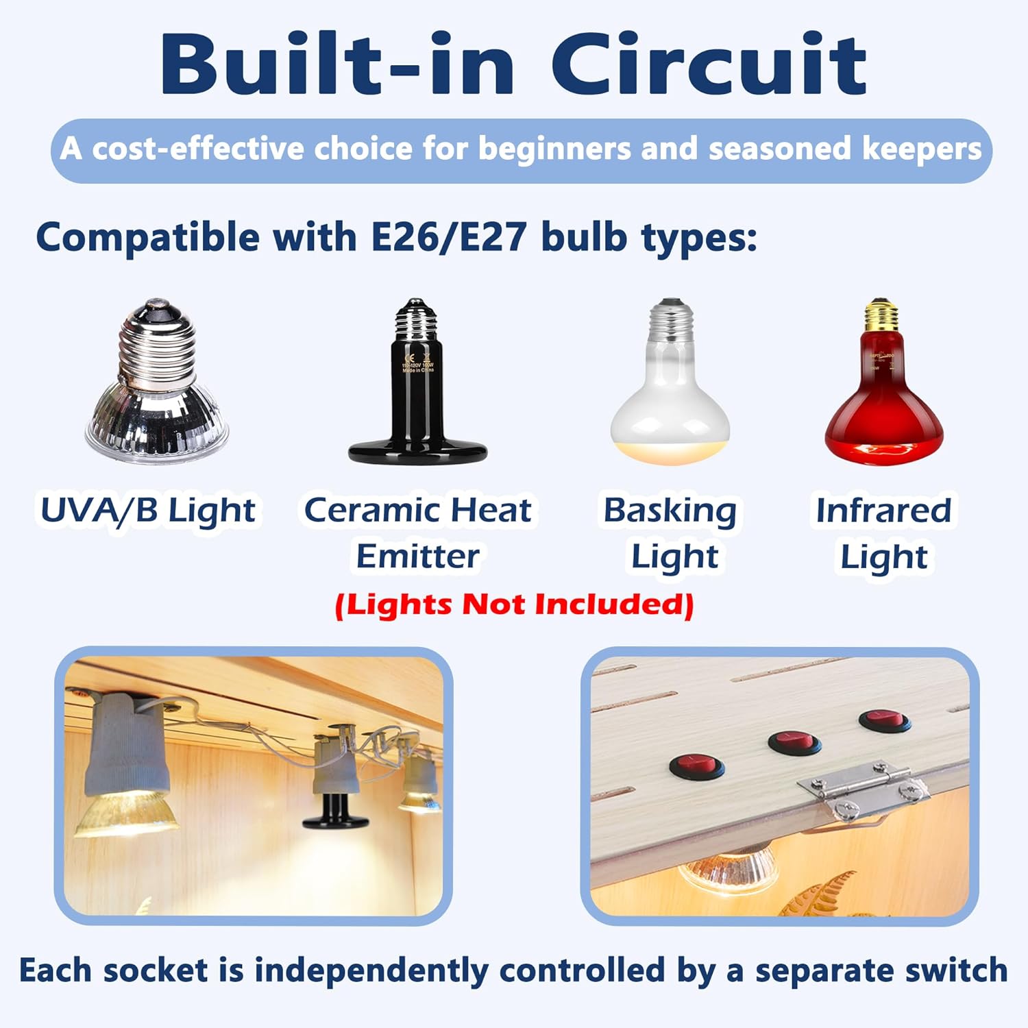 - 【Convenient Bulb Sockets】Equipped with built-in bulb sockets and switches (three in the 40/48-inch version), our terrarium accommodates various E27 bulbs for heating, lighting, and night illumination (bulbs not included). Installing the lights is a breeze, making it an ideal habitat for your reptiles.